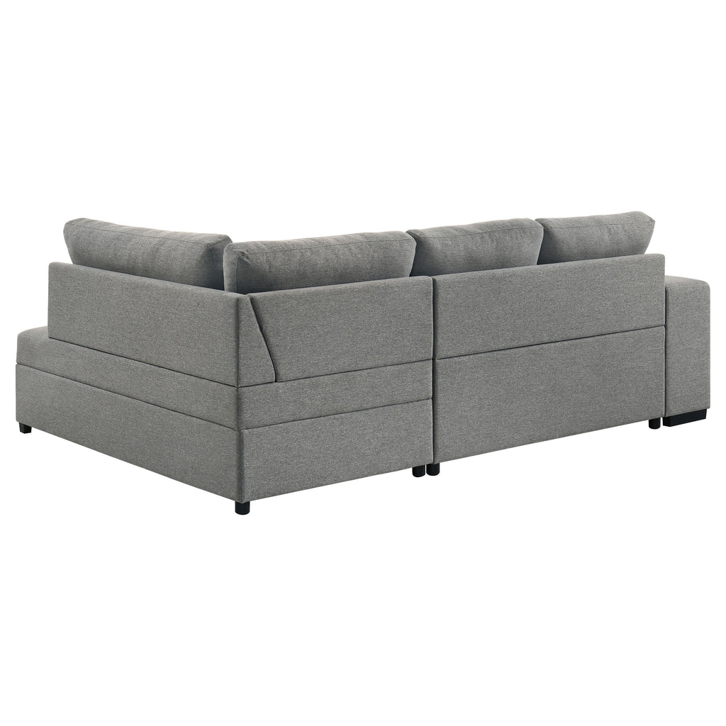 Effortlessly blending beauty and utility, this sleeper sectional invites you to unwind in tailored comfort. Draped in soft grey fabric, its tufted cushions exude quiet elegance, while the generous silhouette offers space to stretch, gather, or dream. Two upholstered stools nest neatly within the armrest, ready for extra seating in an instant. A pull-out bed welcomes overnight guests, and the chaise conceals spacious hidden storage—perfectly designed for life lived beautifully. Key Features: • Sleeper sectional sofa with tufted cushions and clean lines for stylish relaxation • Grey fabric upholstery brings soft texture and versatile modern charm • Pull-out sleeper bed transforms the sofa into a cozy guest accommodation • Lift-up chaise conceals hidden storage for blankets, pillows, or everyday needs • Includes two upholstered stools that nest seamlessly into the sofa armrest • Perfect for compact spaces needing elegant form, comfort, and flexible seating