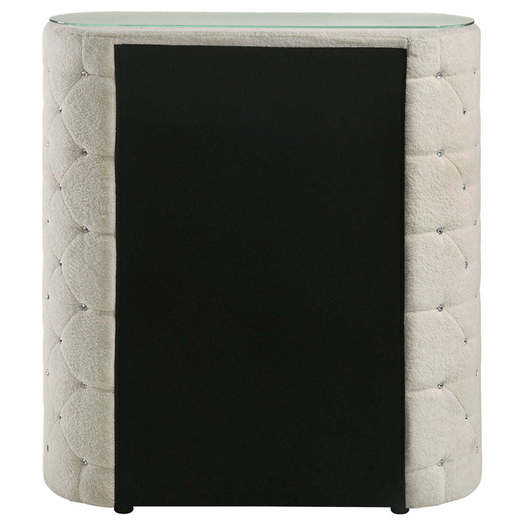 Elevate the everyday with a chest of drawers that exudes sophistication and softness. Upholstered in ivory boucle, this tall silhouette is adorned with five vertically channeled drawers, each accented by glistening crystal-style pulls. Diamond tufting along the sides adds plush dimension, while the clear tempered glass top offers both elegance and protection. Perfectly proportioned for compact spaces, this chest adds storage without compromising on romance. Key Features: • Chest of drawers features plush ivory boucle upholstery with tall, space-saving proportions • Five vertically channeled drawers offer organized storage with elegant texture • Crystal-style drawer pulls provide a luxurious accent with reflective shimmer • Diamond-tufted side panels introduce soft structure and a glam-inspired look • Clear tempered glass top delivers a durable surface while preserving the fabric finish • Crafted from solid rubberwood, engineered wood, boucle fabric, and foam for longevity