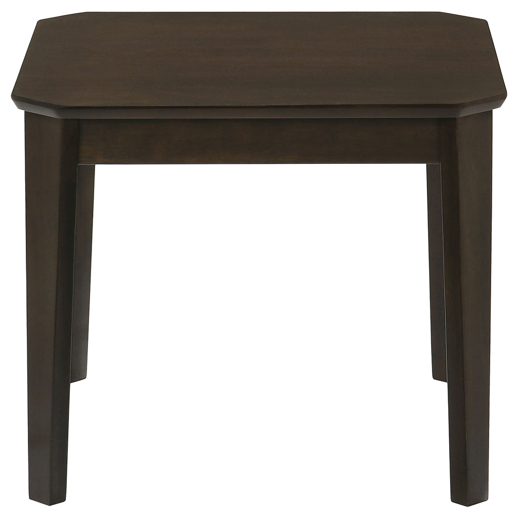 Add a timeless touch to your living room with this three-piece coffee table set. Featuring a coffee table and two side tables, each piece showcases a rich dark brown finish for a classic appeal. The smooth tops with notched corners add charm while providing functionality. Built from rubberwood, engineered wood, and Okume veneer, these tables are durable and stylish. The slim, tapered legs complement the minimalist design, making this occasional table set a perfect choice for compact spaces. Key Features: • Three-piece coffee table set includes one coffee table and two side tables • Dark brown finish adds warmth and a classic aesthetic to living spaces • Smooth tabletops with notched corners offer a soft, refined look • Slim, straight legs with subtle tapering provide stability and style • Constructed from rubberwood, engineered wood, and Okume veneer • Compact design ideal for small or cozy living room arrangements