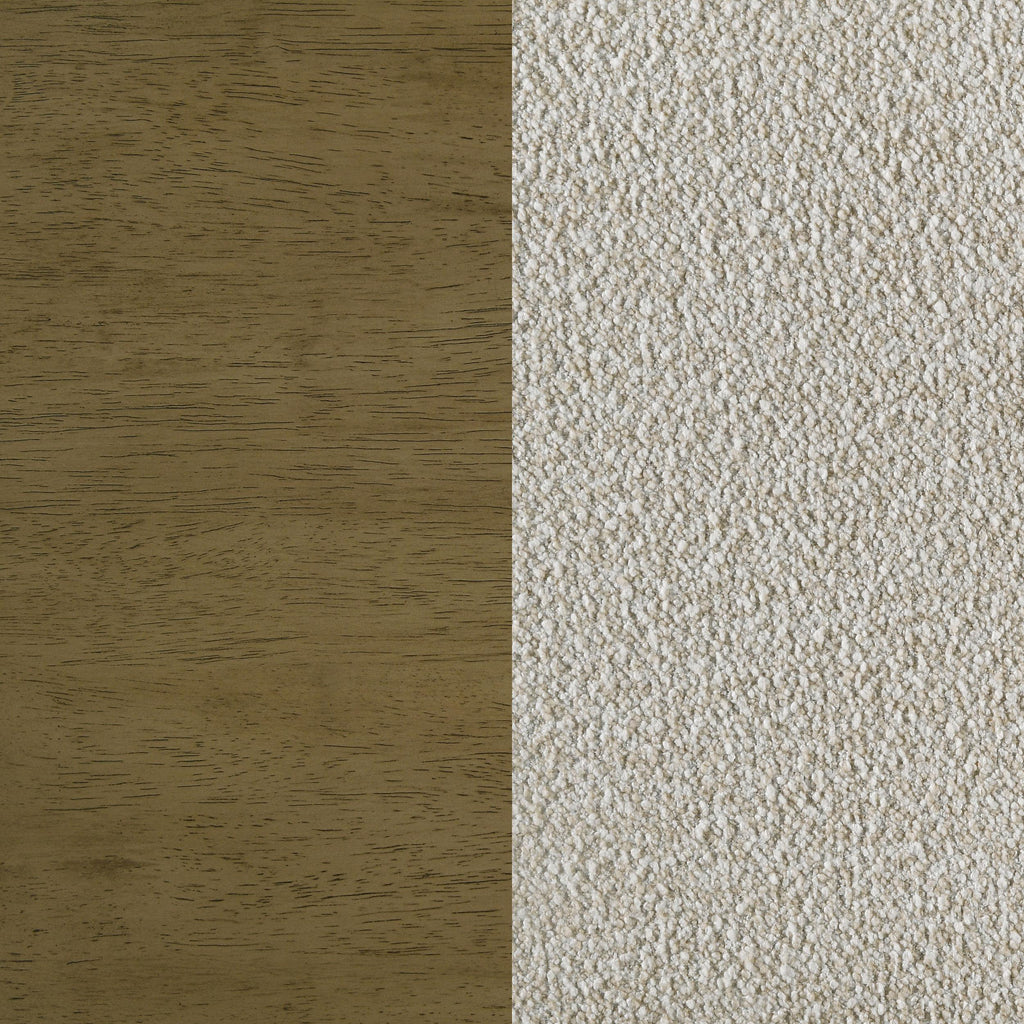 This panel bed brings a bold, modern touch to your bedroom with its clean lines and rounded corners. The warm nutmeg wood finish complements the vertical channels of the beige boucle upholstered headboard, creating a striking contrast between texture and tone. The bed's sleek design adds a contemporary flair while maintaining a minimalist profile. Crafted from solid rubberwood, this bed ensures durability and long-lasting beauty. Its frame offers a stable foundation for your mattress, providing both style and function. Key Features: • Queen panel bed with clean lines and rounded corners • Nutmeg wood finish enhances the modern aesthetic • Vertical channeled beige boucle upholstered headboard adds texture • Sleek design with minimalist appeal • Crafted from solid rubberwood and engineered wood for durability