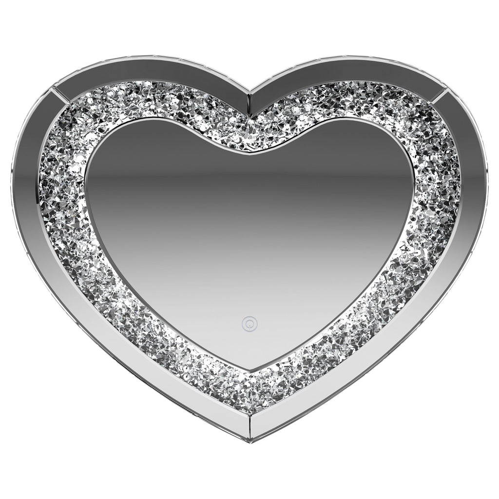 This heart-shaped wall mirror adds sparkle and function to glam-inspired spaces. Framed with mirrored glass and outlined by faceted acrylic crystal inlay, it delivers high-shine appeal. Integrated LED lighting enhances visibility for makeup, grooming, or daily routines. Designed for wall mounting, this decorative mirror combines charm and practicality—ideal for bedrooms, vanities, or dressing areas needing both style and illumination. Key Features: • Wall-mounted heart-shaped mirror designed to double as a decorative and functional piece • Framed in mirrored glass for sleek, high-shine style and glam appeal • Inset acrylic crystal inlay adds sparkle and textural contrast around the border • LED lighting built into the mirror for enhanced visibility during grooming • Ideal for bedrooms, vanities, or personal dressing areas with bold flair • Mounts securely to the wall and adds charm to glam-themed interior spaces