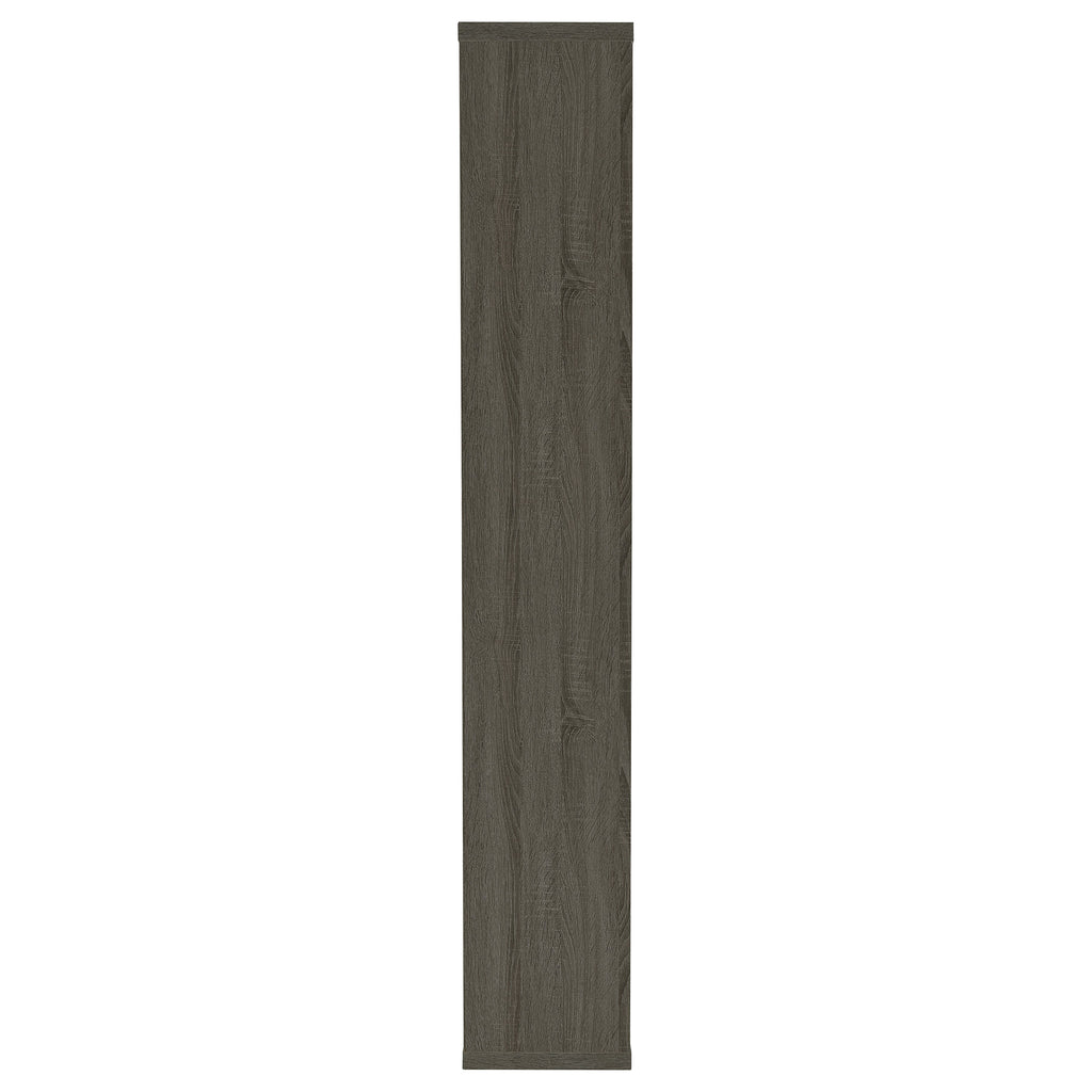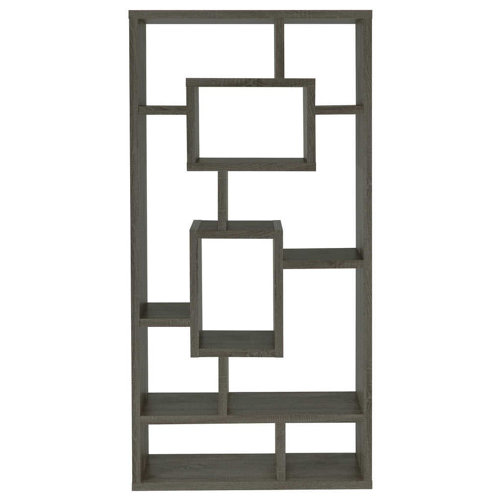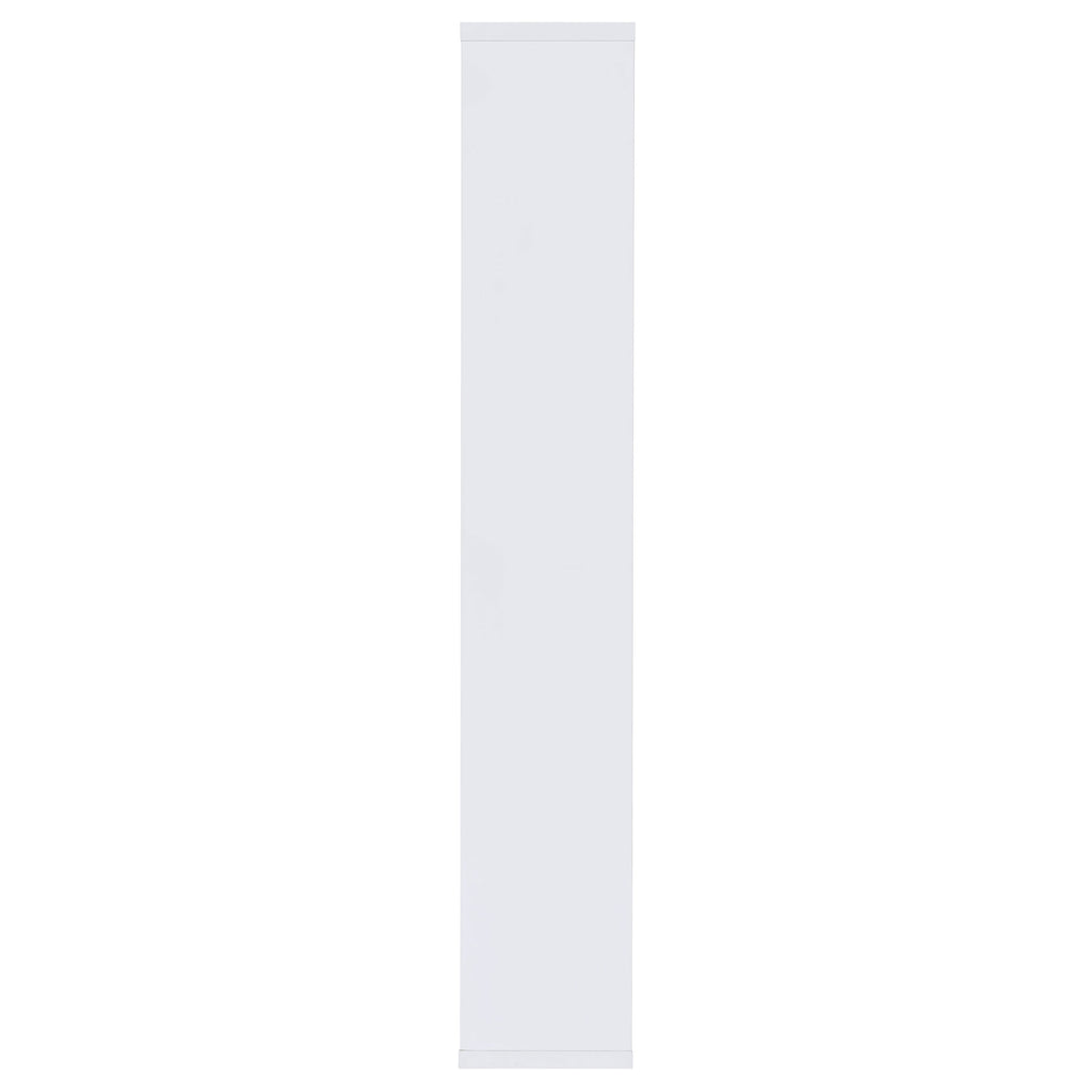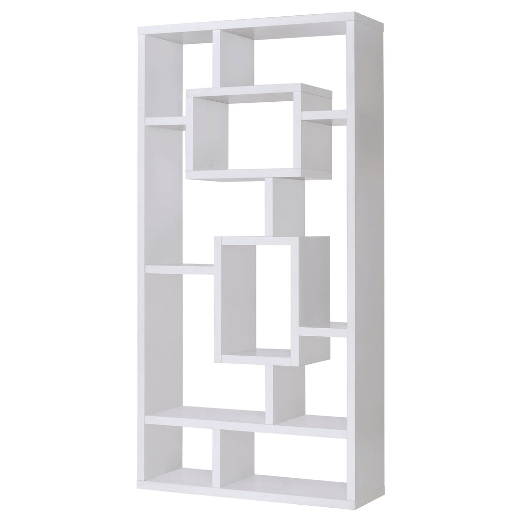 Put your most cherished memories on proud display. This bold bookcase features ten shelves of various sizes to show off your favorite keepsakes. With expert craftsmanship and high-quality materials, it provides safe, sturdy storage. Its cool, contemporary silhouette adds artsy appeal to a room with its striking, geometric shapes. This bookcase is available in white, cappuccino, or weathered grey for a variety of options to fit any decor. Key Features: • Geometric ten-shelf bookcase in white for modern display and organization • Asymmetrical shelving accommodates books, art, and everyday items • Engineered wood core with scratch-resistant laminate veneer • Vertical structure maximizes display while conserving floor space • White finish offers a versatile base for color styling or neutral tones • Includes tip-over restraint hardware for safe wall mounting