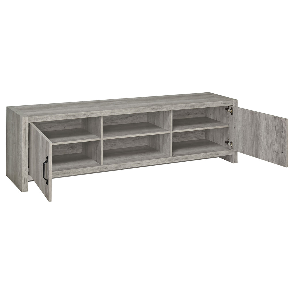 Elevate your living space with this sleek 59-inch TV stand that combines clean lines and versatile storage. A modern grey driftwood finish adds a light, airy feel to any entertainment area. Designed to accommodate TVs up to 65 inches, it features a wide top shelf, two open side compartments, and dual drawers with black hardware for contrast. Perfect for organizing devices, décor, and accessories, this stand is crafted from engineered wood with a durable laminate veneer for lasting style. Key Features: • 59-inch TV stand accommodates TVs up to 65 inches • Grey driftwood finish adds brightness and contemporary appeal • Two drawers with black hardware provide enclosed media storage • Open shelving offers easy access for devices and display décor • Engineered wood with laminate veneer ensures lasting durability • Perfect centerpiece for transitional or modern entertainment areas
