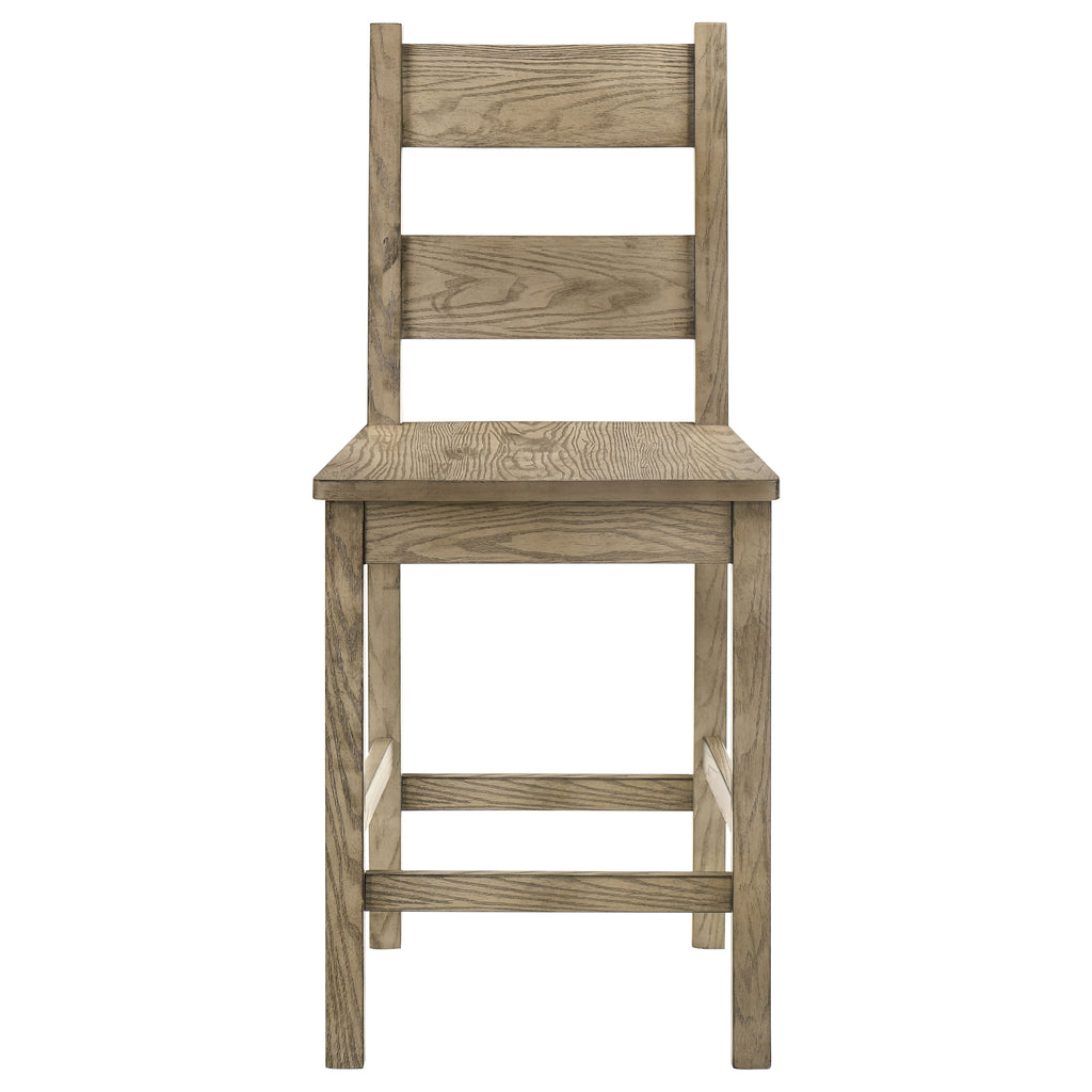 This counter height dining chair blends rustic character with practical design, perfect for casual elevated dining. Its tall ladder back offers supportive comfort, while the flat wooden seat provides a sturdy surface for everyday use. Crafted from solid rubberwood, the durable frame is coated in a vineyard oak finish that accentuates the natural wood grain. Ideal for pairing with counter height tables, it adds warmth and timeless appeal to any gathering space. Key Features: • Counter height chair features a tall ladder back for supportive elevated seating • Vineyard oak finish highlights authentic grain detail with rustic farmhouse character • Flat wooden seat provides a stable dining surface for everyday use and easy maintenance • Solid rubberwood frame delivers strength, durability, and long-lasting performance • Integrated footrest offers ergonomic support and balance for elevated dining comfort • Pairs perfectly with counter height tables for casual and rustic dining room settings