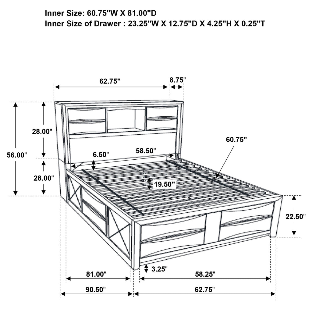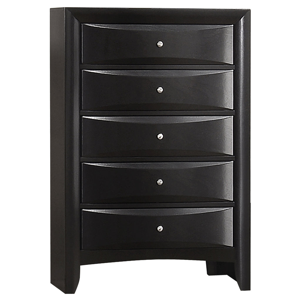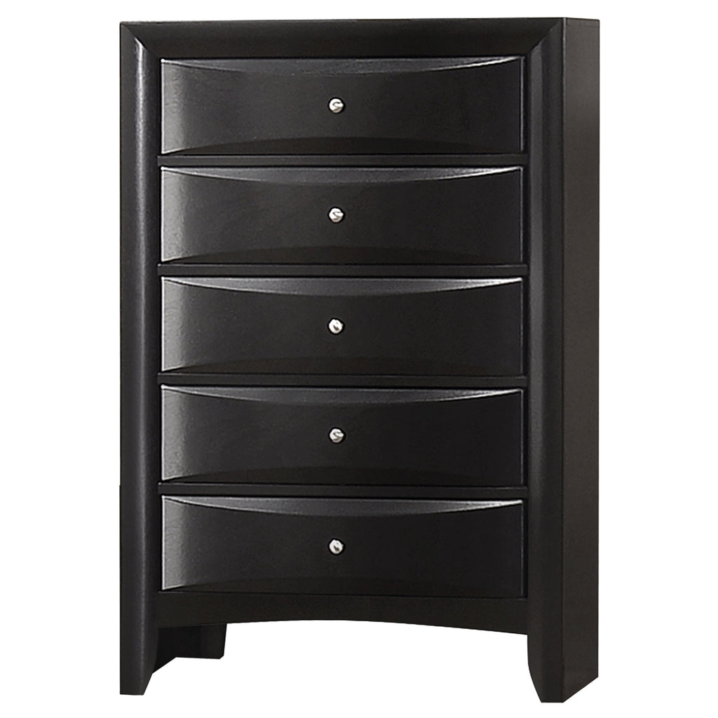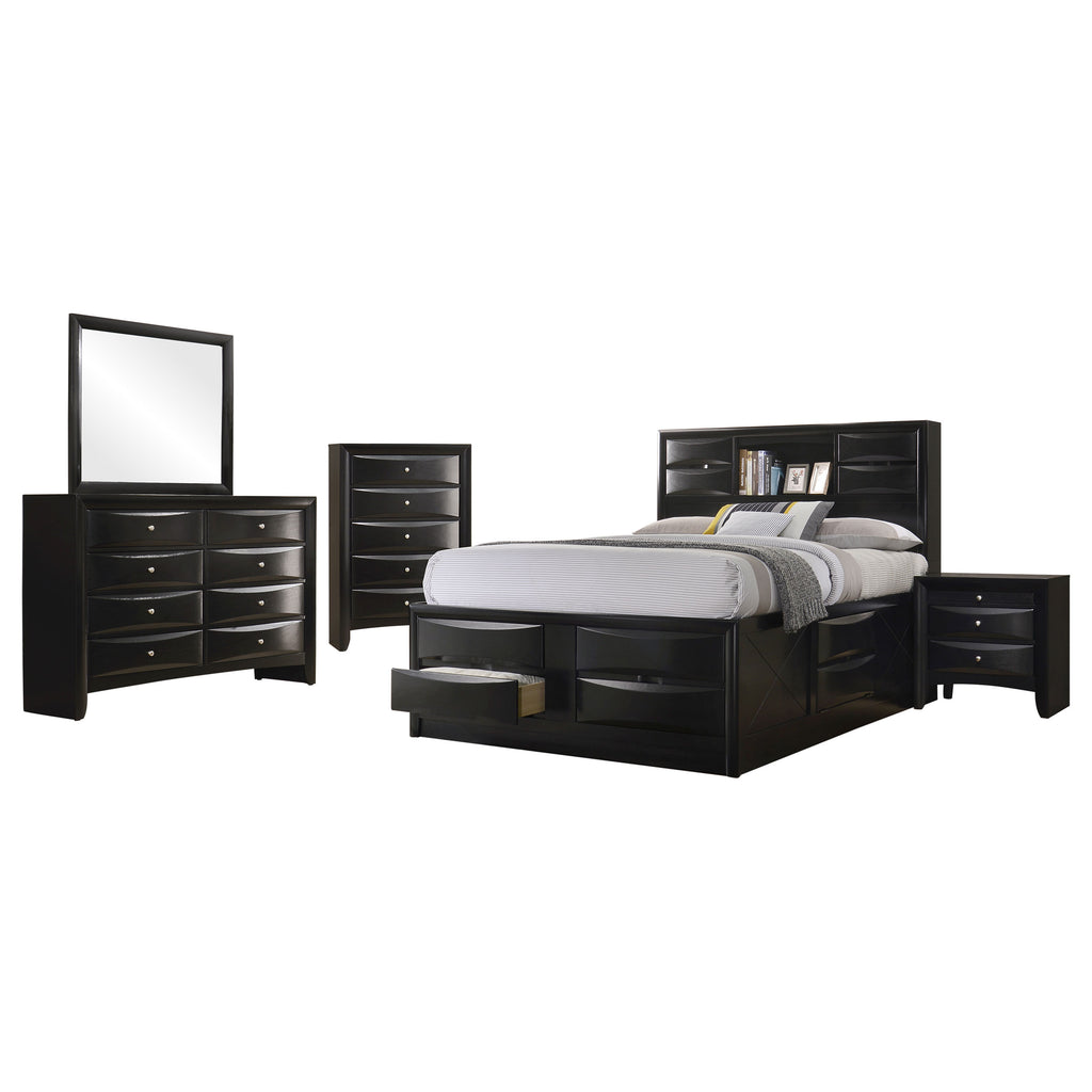 Transform your bedroom with this sophisticated storage bedroom set that combines timeless style and practical function. Finished in sleek black, the platform bed features four drawers in the footboard and hidden compartments behind drop-down doors on the headboard and side rails. The bookcase headboard includes four drawers and a center shelf for accessible storage. Complementary case pieces echo the look with chambered drawer fronts and brushed nickel hardware, creating a refined and cohesive space. Key Features: • Four-piece queen bedroom set with refined transitional styling • Platform bed includes four footboard drawers for added storage • Drop-down doors on headboard and side provide hidden compartments • Bookcase headboard with four drawers and open center display shelf • Chambered drawer fronts enhance texture and dimensional character • Brushed nickel hardware contrasts beautifully with the black finish