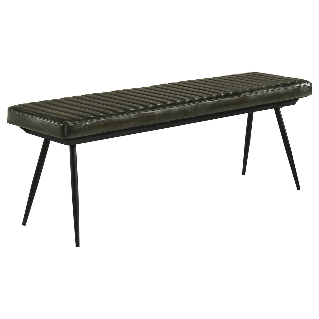 Retro charm is on full display in a dining ensemble that recreates a popular past era. Warm tones and a festive look indulge Mid-Century Modern attitude in this five-piece casual dining set. A rectangular wood and iron dining table anchors this stylish set, embellished with tilted open leg braces. Side chairs feature iconic retro-inspired metal framing with slender, rounded legs that splay to create perfect proportion. This set includes a rectangular dining table and four side chairs with channeled tufting upholstered.