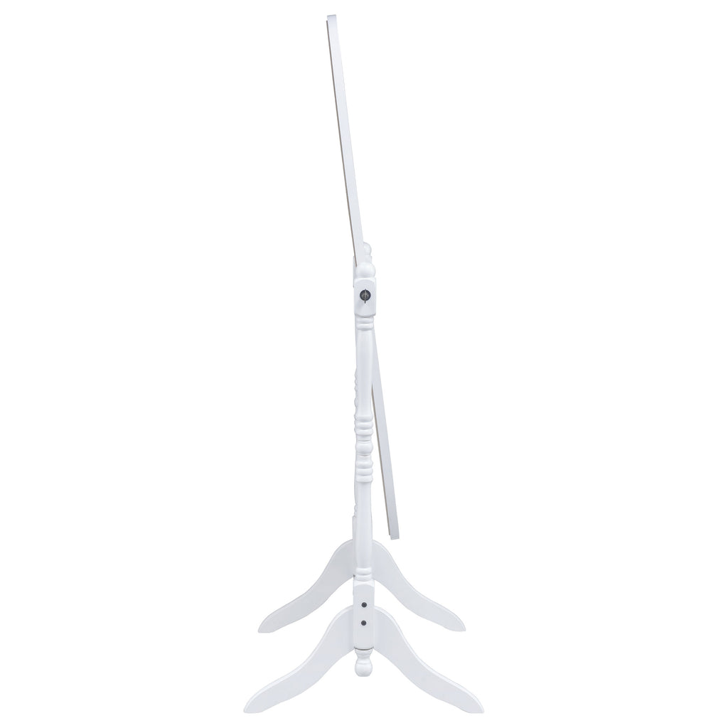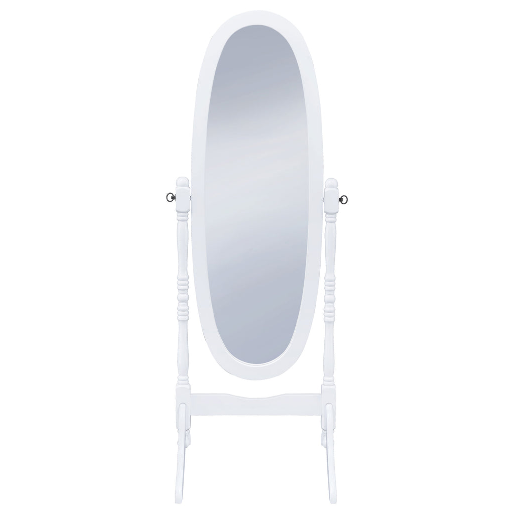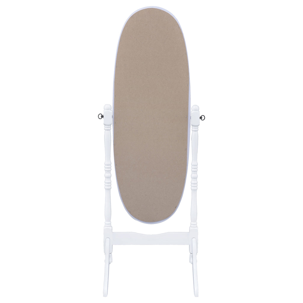 Traditional elegance with a functional twist. This cheval mirror delivers a charming look for a bedroom or dressing space. Full-length mirrored glass with a swivel base offers various viewing perspectives. A selection of lovely finishes blends beautifully in practically every setting. Charming curved legs adds a fresh, stylish look. Key Features: • Traditional oval cheval standing mirror feels like an heirloom piece • Oval wood frame on stand with turned posts • Clear mirror surface • Available in merlot, honey black, and white • Rubberwood construction