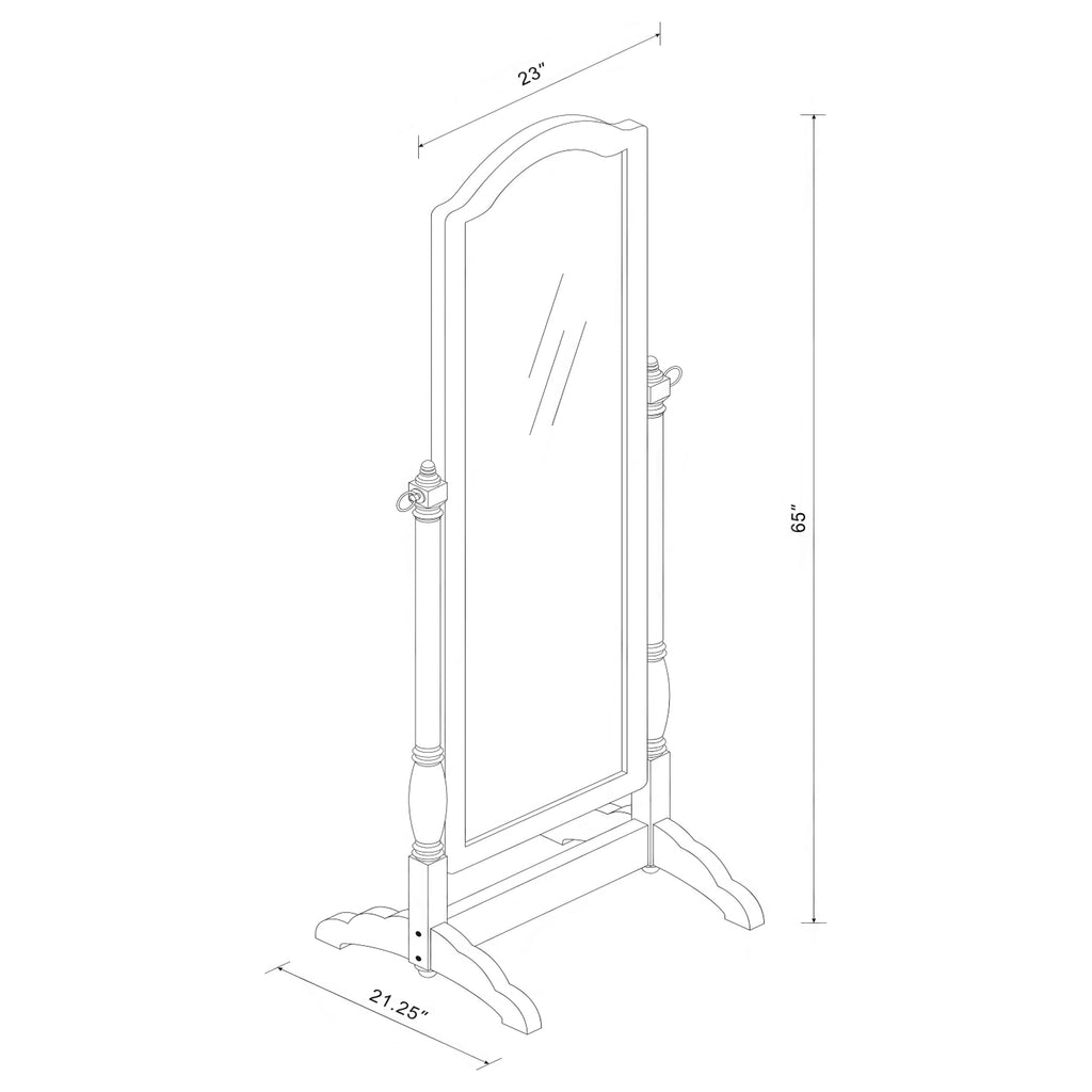 With a delicate silhouette, this cheval mirror adds a delightful touch. Bring character to a traditional space with a swivel mirror offering a full view. Ornate tailoring yields a tasteful shape that conforms to vintage French cottage styling. This mirror is perfect for a master bedroom or dressing space. Select the perfect finish to complete your custom look. Key Features: • Traditional cheval standing mirror has an antique feel • Frame features arched top and stand with turned posts • Clear mirror surface • Available in white, black, and red brown • Rubberwood construction