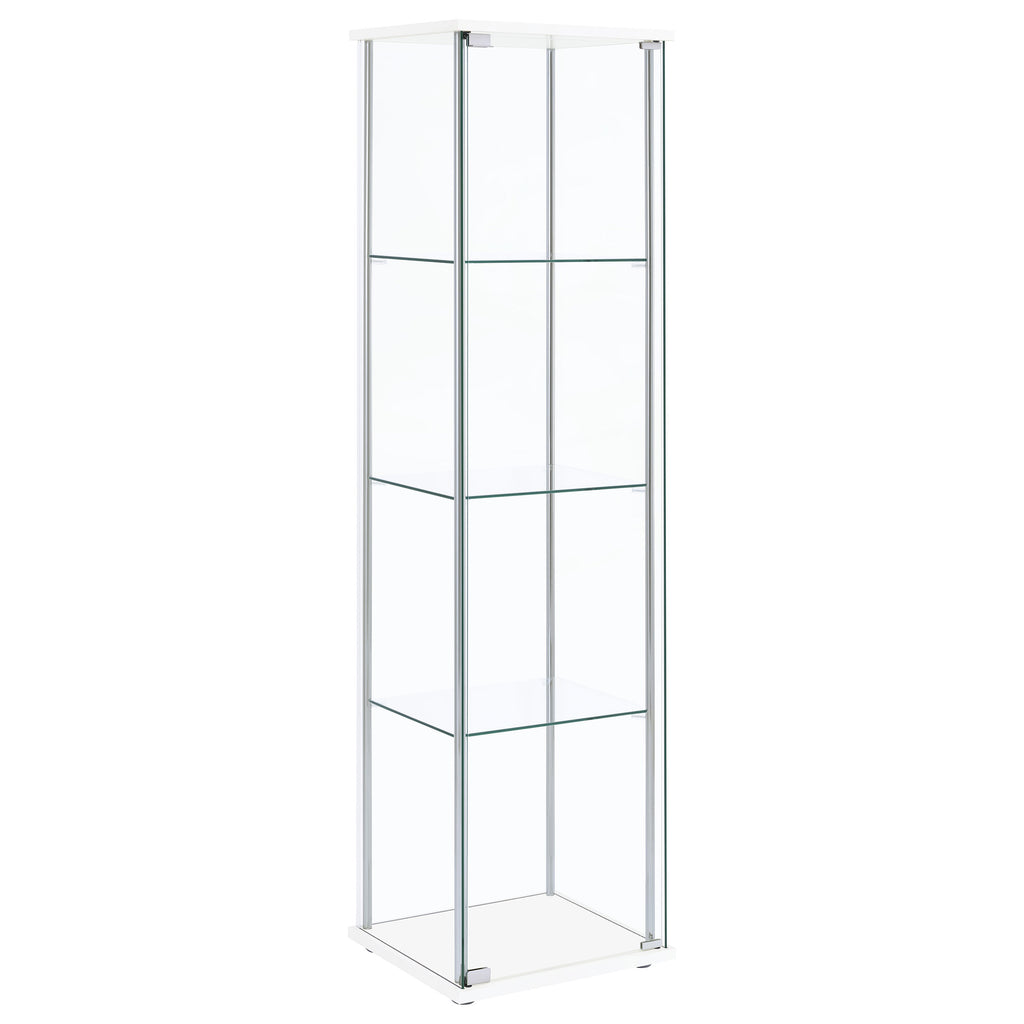 This curio cabinet blends modern simplicity with timeless display function, offering a tall, streamlined silhouette. Clear tempered glass panels and three sturdy shelves create an airy showcase for treasured keepsakes. Chrome tone supports frame the design with contemporary flair, while a rectangular top and base add subtle stability. Crafted with glass, engineered wood, and laminate veneer, this cabinet serves as both storage and statement in living or dining spaces. Key Features: • Curio cabinet with cappuccino base and top, four shelf design, chrome supports, clear glass • Cappuccino finish curio cabinet, rectangular top and base, chrome supports, tempered glass • Four shelf curio cabinet in cappuccino, clear tempered glass shelving, chrome metal accents • Cappuccino finished base with chrome support beams, three tempered glass shelves, tall frame • Modern cappuccino curio cabinet with chrome details, engineered wood base, tempered glass door • Cappuccino tone cabinet with chrome structure, laminate veneer base, three glass shelves inside