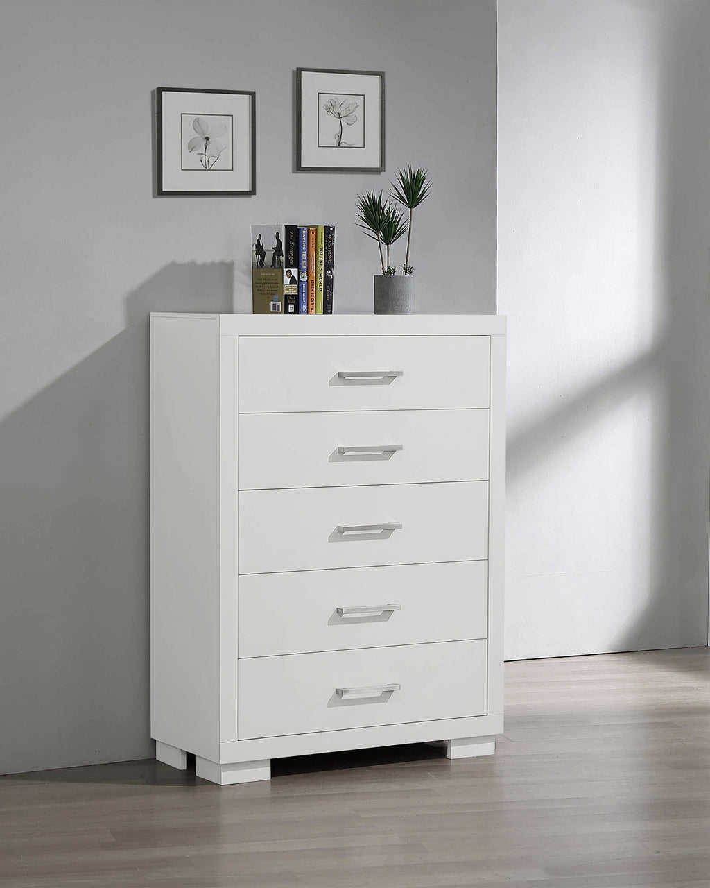 Graceful proportions and contemporary simplicity define this five-drawer chest. Designed for both elegance and function, its spacious drawers glide open to reveal generous storage for garments and essentials. Sleek bar pulls accent the clean lines of its modern silhouette, while a smooth finish enhances the natural warmth of the wood. With refined balance and lasting craftsmanship, this piece elevates the art of everyday organization. Key Features: • Five-drawer chest designed with sleek lines and understated refinement • Snow white finish brightens interiors with a clean, radiant appearance • Felt-lined top drawer cushions jewelry and delicate accessories • Silver-tone bar pulls lend graceful contrast with contemporary flair • Rubberwood and engineered wood frame ensures durability and poise • Tipover restraint included for stability and peace of mind in use