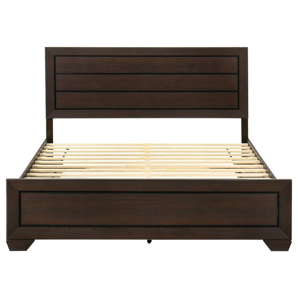 Indulge in a love of basic nature. Fresh, inspiring aesthetics combine to make this bed a great choice for a transitional room. Linear design elements create optically pleasing balance while a washed taupe finish results from a gorgeous patina in greyish-brown. Side storage increases utility. This bed serves beautifully through a series of room redesigns. Key Features: • Storage panel bed with bold rectangular framing and a streamlined silhouette • Washed taupe finish highlights wood grain texture with contrasting black grooves • Includes dual drawers on each side rail for concealed underbed storage • Recessed panel headboard offers visual depth and structured design • No foundation required thanks to supportive slatted base construction • Engineered wood build with durable laminate veneer and framed case detailing