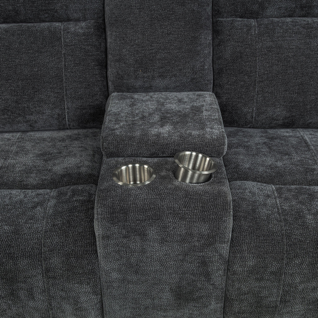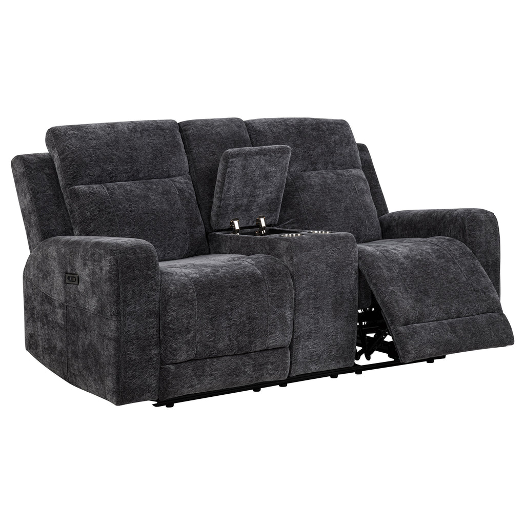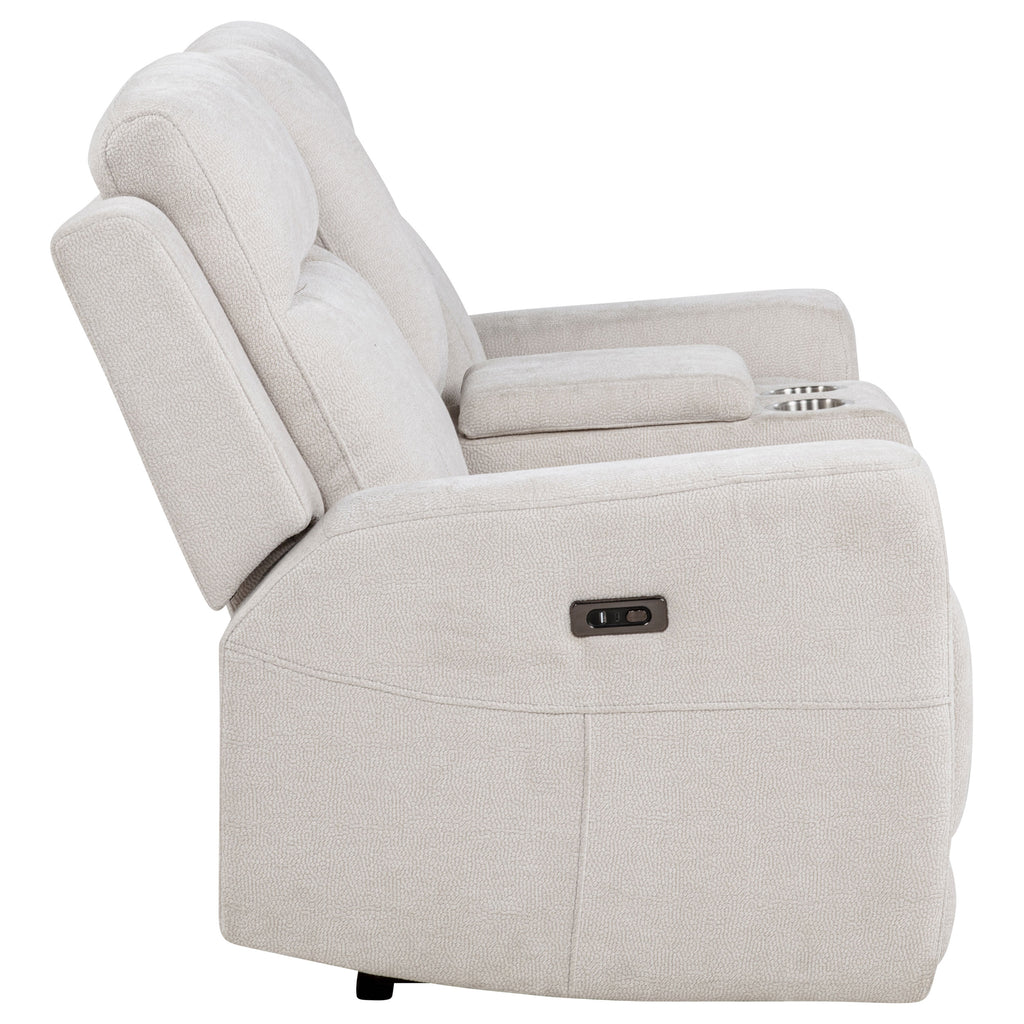 Unwind in perfect sync with this chenille power reclining loveseat, crafted for shared comfort and convenience. Dual recliners offer smooth, quiet motion at your touch, while a center console adds thoughtful storage with a lift-top compartment and two removable stainless steel cup holders. Wrapped in soft, textured chenille and reinforced with a durable metal frame, this piece blends everyday luxury with functional ease. Key Features: • Power loveseat with smooth dual recliners offers effortless, personalized comfort • Ivory chenille upholstery adds softness and a subtle textured visual appeal • Center console features lift-top storage for remotes, books, or other items • Includes two removable stainless steel cup holders for clean and easy use • Durable metal framing supports long-term strength and daily reliability • Polyester chenille fabric balances plush comfort with easy-care maintenance