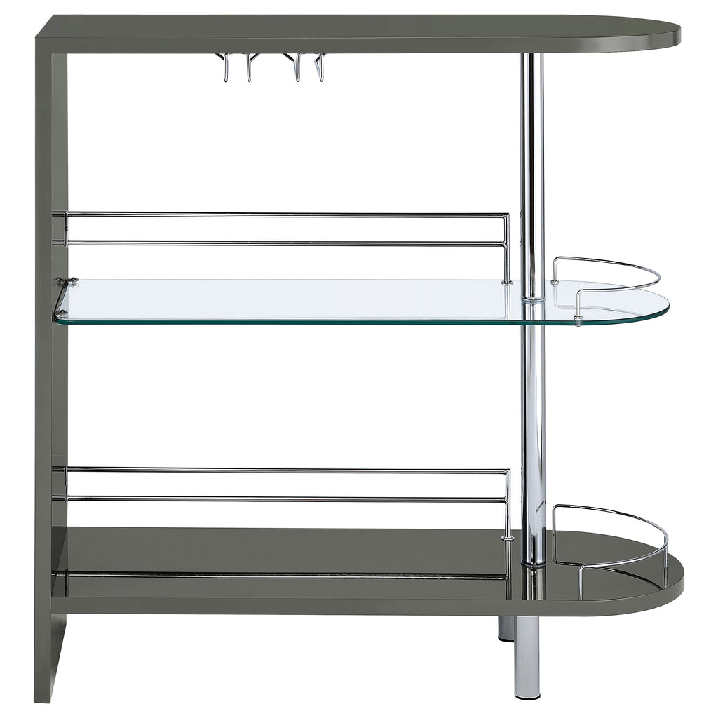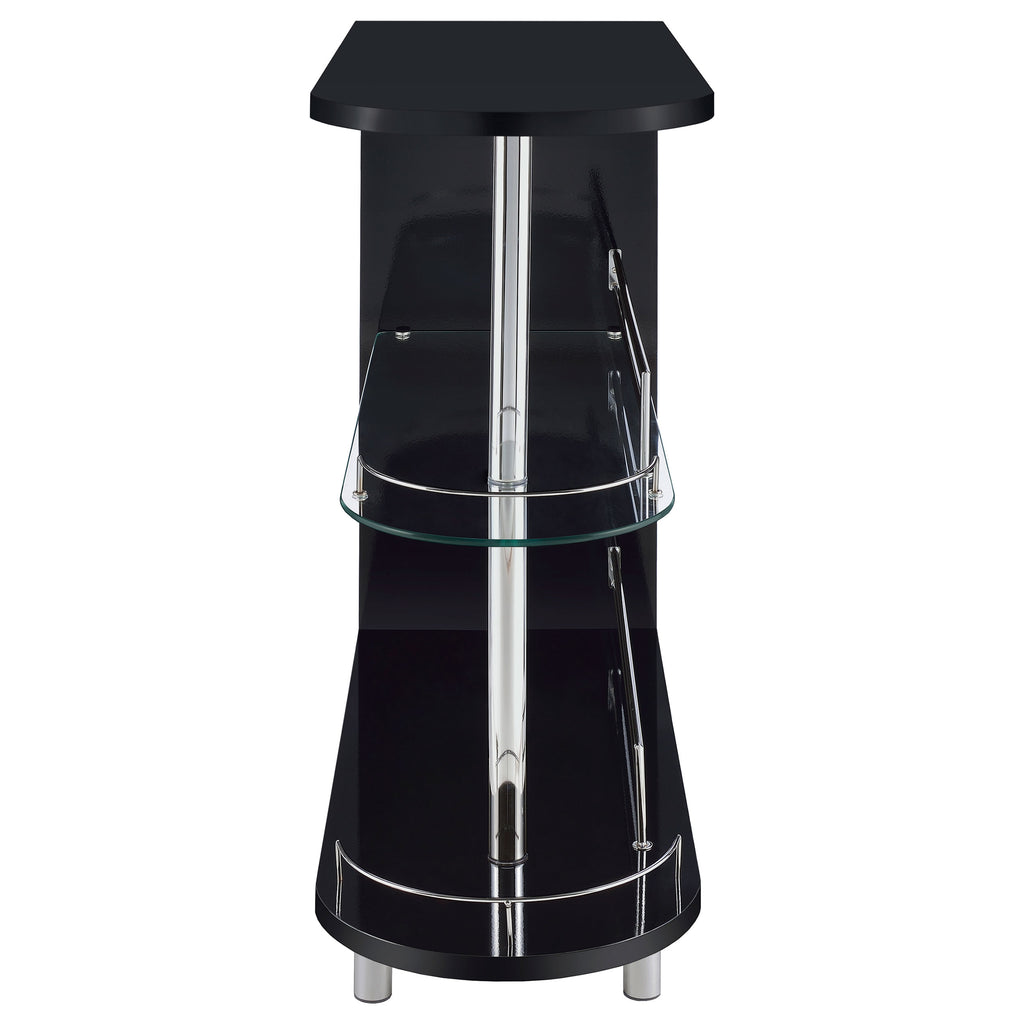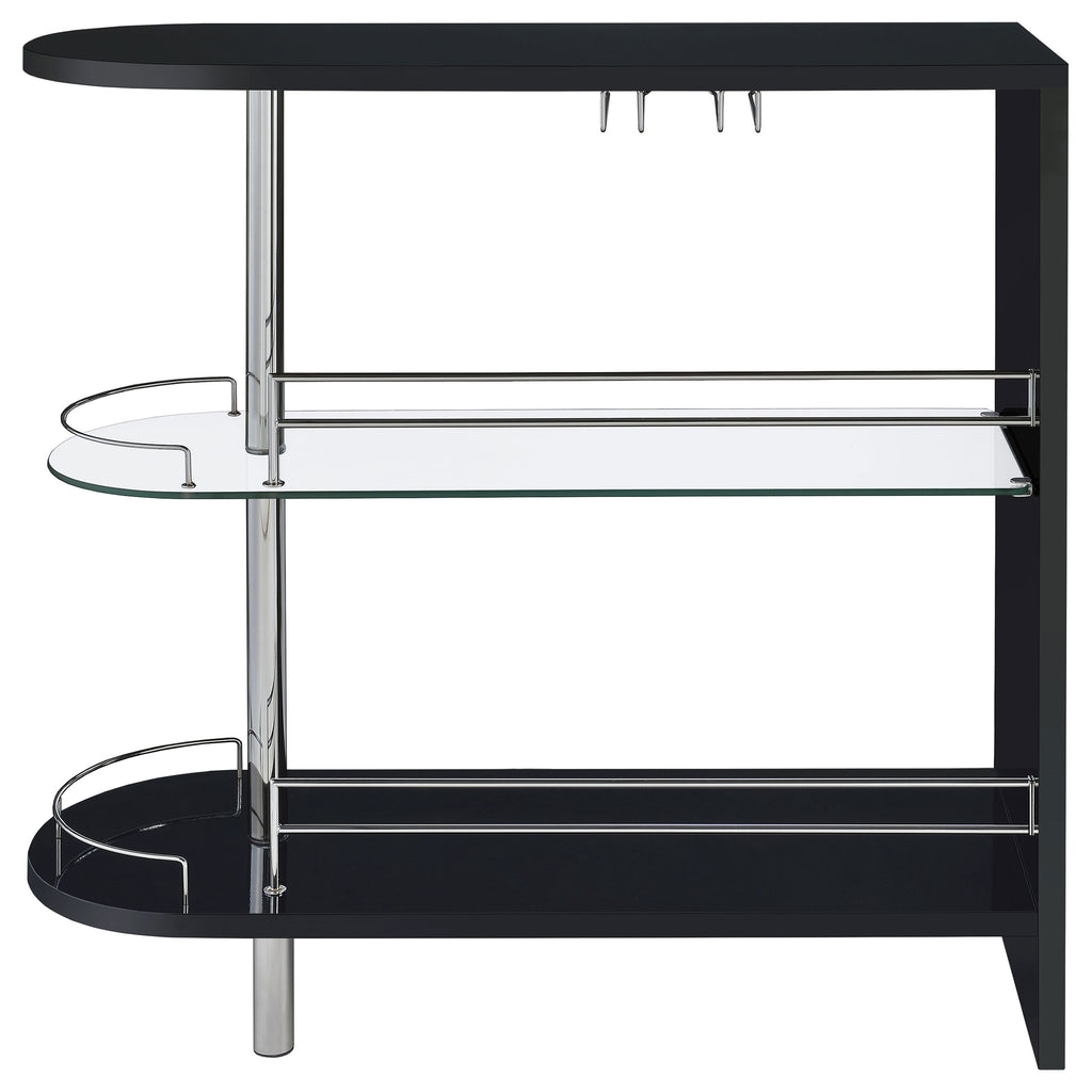 This stylish bar unit is a fabulous option for your entertaining needs. A sleek silhouette and glossy black finish give it a chic, modern appeal. Its tempered glass storage shelves offer a handy place to display a collection of fine wines and spirits. Protective guardrails help prevent accidental spills and keep bottles safe and secure. A handy stemware rack rounds out the versatile convenience of this contemporary bar unit. Key Features: • Rounded end adds an elegant feel to this glossy black bar unit • Clear tempered glass shelf adds stability for your choice of spirits • Storage features include two (2) tiers of shelving, including one (1) glass shelf with guardrails, and stemware racks • Steel, MDF, and laminate construction • Your choice of glossy black, glossy white, or glossy grey