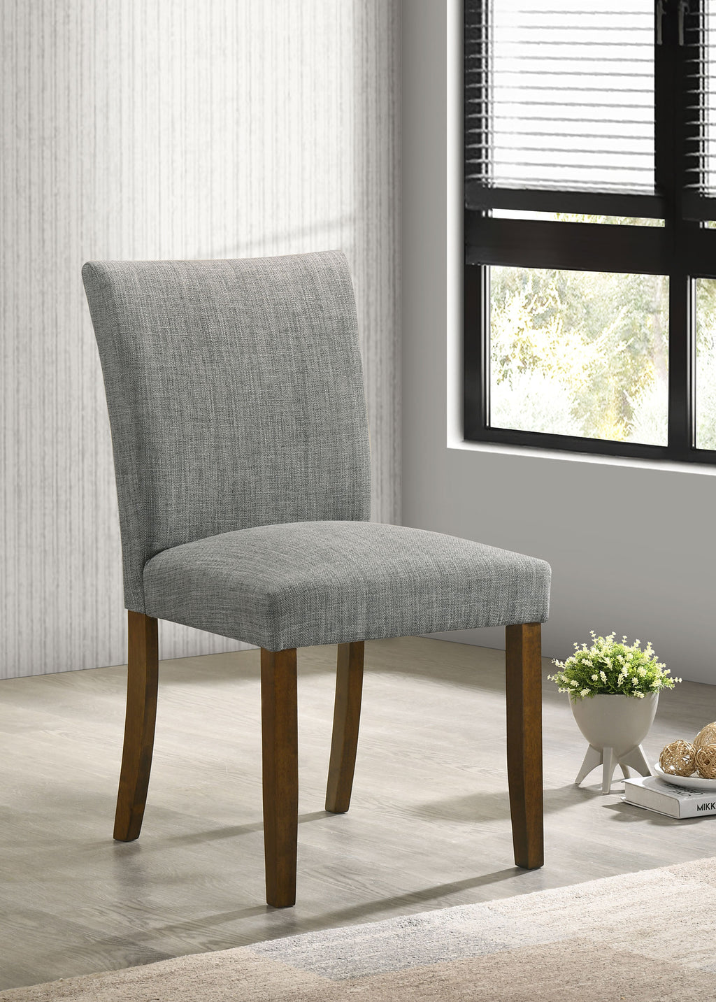 Upgrade your dining table with the fresh silhouettes and contemporary flair of this set of two modern side chairs. Each boasts an armless profile and lovely upholstery that creates the perfect touch of texture. Foam cushions provide exemplary comfort, perfect for everything from weeknight meals with the family to entertaining. Brown finish wood legs provide stability and create a hint of contrast against the upholstery. Choose this set for a new or existing dining table to bring a breath of fresh air. Key Features: • A streamlined profile and luxe upholstery complement a set of two contemporary dining chairs • Features an armless profile with a gently curved back for excellent support and comfort • Supportive squared legs feature a rich brown wood finish and provide excellent stability • Made with rubberwoods and foam cushioning complemented with fabric upholstery • Each chair features a generous weight capacity of 300 pounds