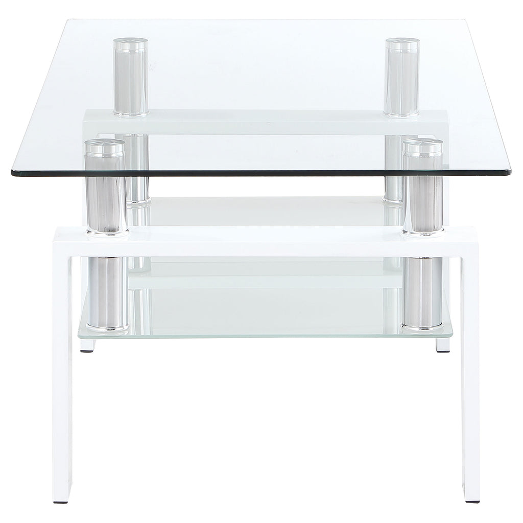 Enhance your living room with this sleek rectangular cocktail table, designed for style and functionality. It features a clear tempered glass top, complemented by a frosted tempered glass lower shelf for added storage or display. Supported by a sturdy metal frame, this coffee table combines durability with a modern aesthetic. Perfect for creating an open and airy look in your space, this table seamlessly blends contemporary design with practical utility. Key Features: • Rectangular cocktail table with a sleek clear tempered glass top design • Frosted tempered glass shelf adds storage space and visual interest • Durable metal frame with a white powder coated finish for a clean look • Stylish modern design perfect for enhancing contemporary living spaces • Clear and frosted glass accents create a bright, open, and airy feel • Versatile table suitable for daily use or entertaining in any living room
