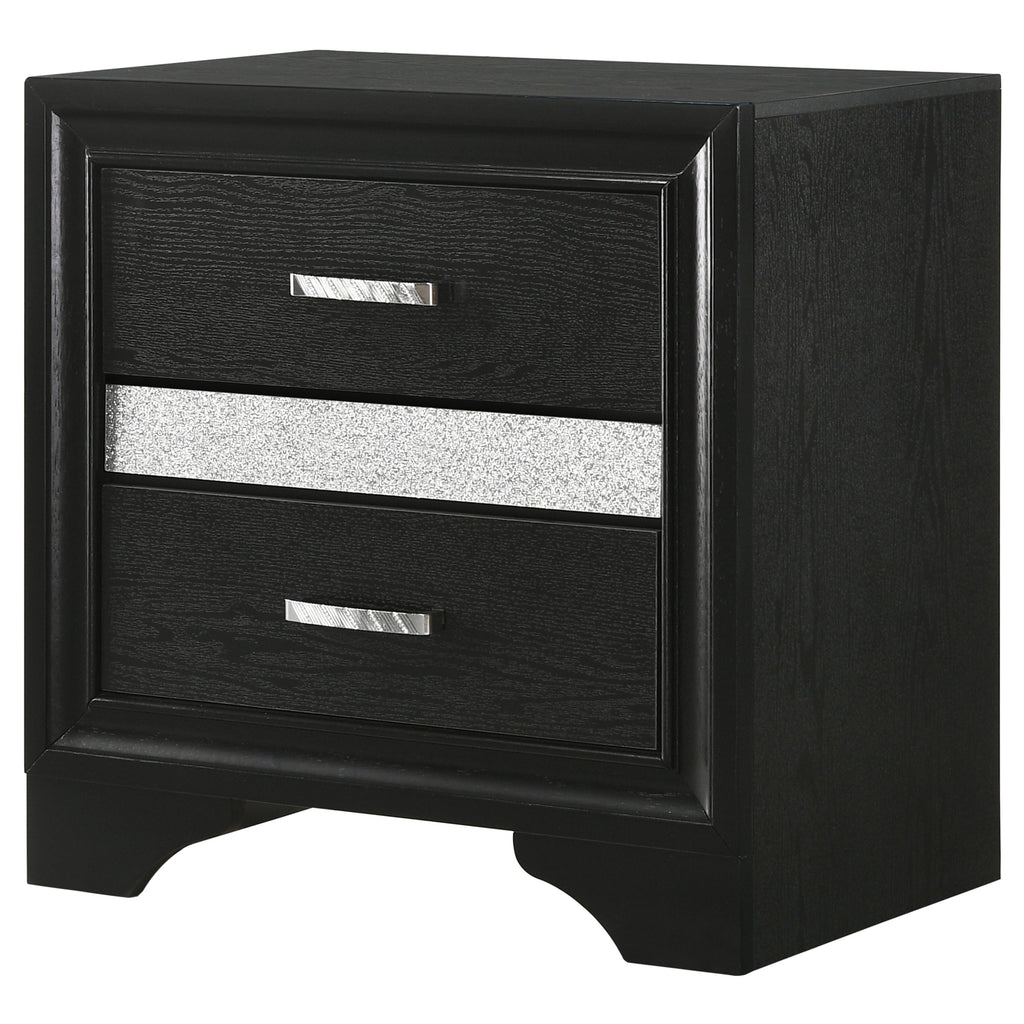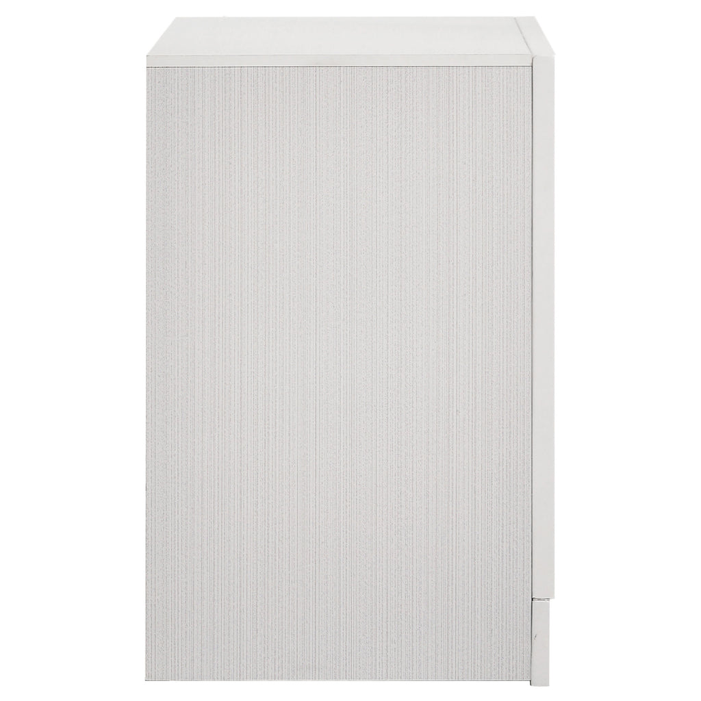 Infused with timeless glamour, this three-drawer nightstand brings refined character to any bedroom. Its linear profile is accented by elegant framing and a glittering center panel that conceals a hidden felt-lined drawer, ideal for delicate accessories. Smooth metal-extension glides ensure effortless drawer operation, while crystal-inspired pulls catch the light with radiant sparkle. Built from engineered wood and finished in a textured laminate veneer, it delivers durability with sophisticated transitional charm. Key Features: • Three-drawer nightstand with smooth full-extension glides • Hidden felt-lined drawer concealed behind glitter accent panel • Crystal drawer pulls enhance the glamorous design • Bright white finish with subtle textural detail on sides • Classic bracket base offers transitional styling • Crafted from engineered wood with laminate surfaces