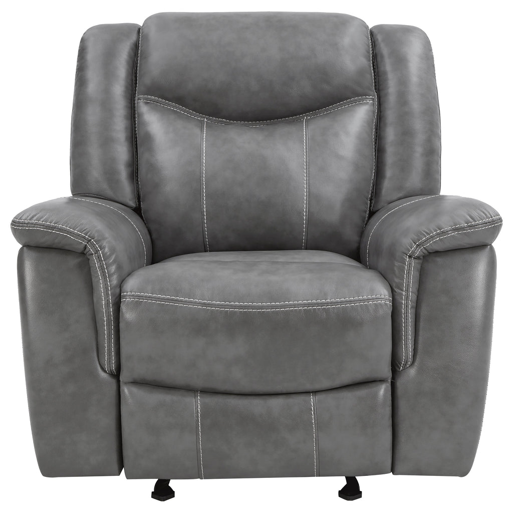 Enjoy superior comfort and smooth motion with this glider recliner chair upholstered in sleek grey faux leather. Designed for everyday relaxation, it features plush padding, overstuffed armrests, and a supportive headrest that enhances lounging comfort. The ergonomic side lever allows quick and easy reclining adjustment, while pocket coil seating and a one-inch cool gel memory foam topper provide exceptional support. Combining luxury and practicality, this recliner delivers the perfect balance of modern design and relaxation._x005F_x000D_ Key Features: • Manual glider recliner chair offers smooth relaxing motion • Grey faux leather upholstery creates a sleek modern look • Plush padded seat, back, and armrests enhance comfort • Ergonomic side lever provides quick easy recline control • Pocket coil seating ensures supportive balanced comfort • Cool gel memory foam topper adds lasting plush softness