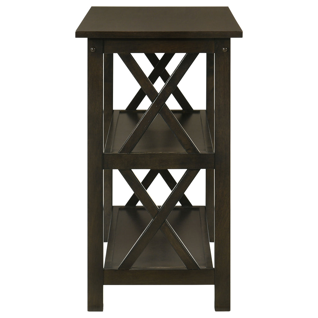Bring an energizing look to a transitional space. With linear styling and geometric x-shapes on its side panels, this console table creates an eye-catching effect. Deep merlot offers a scrumptious, dramatic finish that blends well with surrounding furnishings. Find plenty of shelf space to match its rectangular surface. Place behind a sofa or against a wall for a central focus. Key Features: • Console table with rectangular top and two open lower shelves for storage and display • Deep merlot finish enhances visual warmth with a rich, dark wood tone • Geometric X-side panel design adds decorative structure and open feel • Designed to function as an entryway table, sofa table, or hallway focal point • Crafted from rubberwood, engineered wood, and rubberwood veneer • Durable shelves offer added support for everyday essentials and decor items