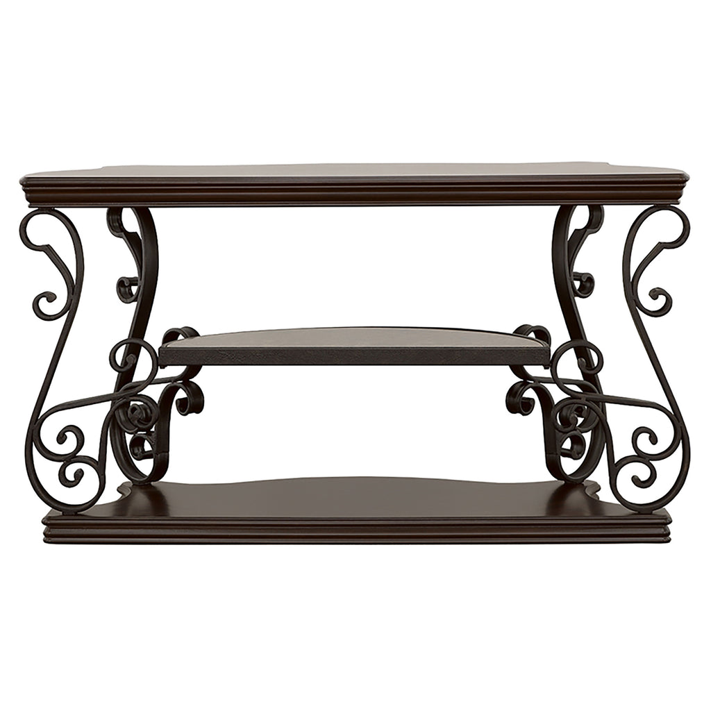 This elegant console table, also known as a sofa table, seamlessly combines style and function. Its dark merlot wood finish highlights the engineered wood and cherry veneer construction, while the ornate scrollwork on the dark bronze powder-coated metal legs enhances its timeless charm. The polished wooden middle and bottom shelves offer additional storage or display space. Perfect for accentuating hallways, living rooms, or behind sofas with classic sophistication. Key Features: • Console table with dark merlot wood finish for a rich and elegant look • Dark bronze powder-coated metal legs with intricate scrollwork design • Engineered wood and cherry veneer ensure a durable and refined construction • Polished wooden middle and bottom shelves offer storage or display options • Blends traditional craftsmanship with practical functionality • Versatile piece ideal for hallways, living rooms, or behind sofas