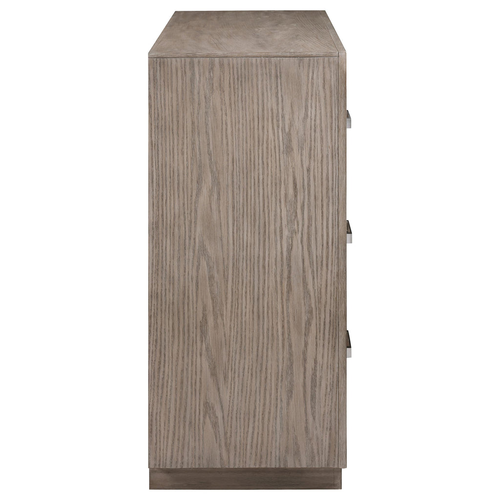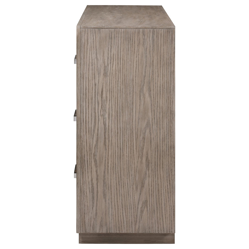 Enjoy the roomy storage and understated character of a modern six-drawer dresser. It's a fresh, understated design that showcases a wide top and recessed base that pair to deliver a timeless look. The dresser shows off wood grain details in a neutral barley brown finish, delivering stylish flair that complements in any setting. Each drawer is equally sized for easy storage and organization. Chrome finish bar pulls add a touch of contrast and textural appeal. Key Features: • Augment your bedroom with the easy, stylish storage featured in this modern six-drawer dresser • Barley brown finish is soft and neutral, offering a fresh palette for the decor of your choice • Six drawers of equal size provide ample storage for clothing, accessories and linens • Mitered trim adds dimension while chrome finish bar pulls complete the look • Recessed base lightens the look while a wide top is ideal for personal decor