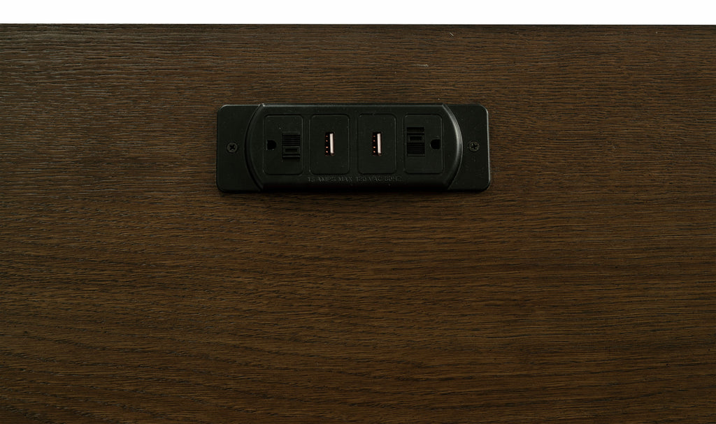 Get creative in how you use and style this attractive Credenza. Its warm burnished oak finish enhances its frame while supported on bracket style legs. Plenty of storage is found within its felt-lined top drawers. Removable dividers allow for extra organization with this piece. Keep your valuables safe and sound within the two lower cabinets that lock with an included key. Key Features: • Credenza with power outlet, USB ports, and locking cabinet • Includes five drawers and two compartments with open shelves • Burnished oak finish paired with antique brass hardware • Felt-lined drawers and removable dividers enhance storage use • Adjustable shelf in cabinet offers versatile functionality • Classic bracket feet and framed construction provide elegance
