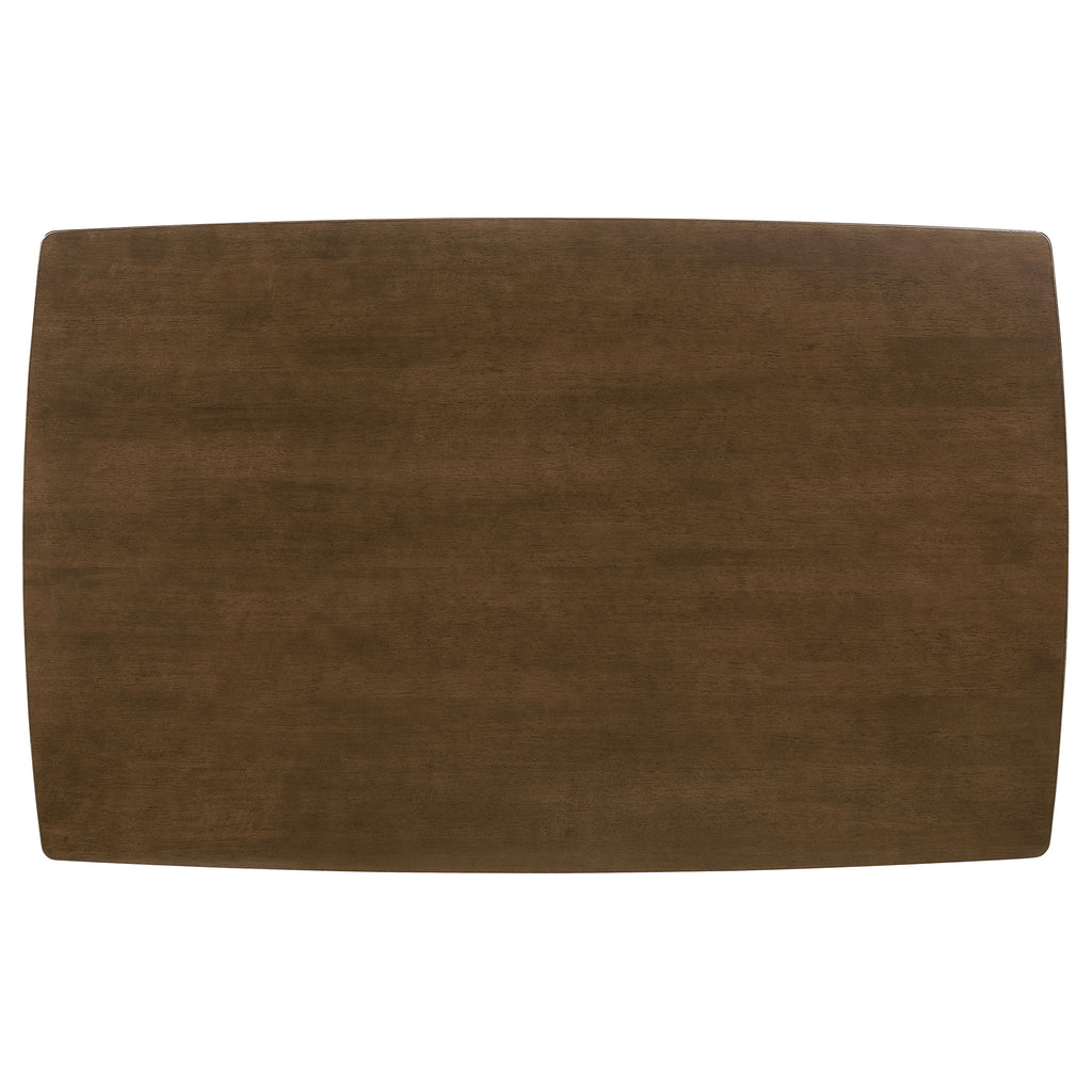 Anchoring the Kersey Collection, this solid wood dining table imparts a retro feel. Rectangular top and angled legs give it a resolute profile. Finished in chestnut that goes well by a sunlit window overlooking a garden. Crafted for functionality yet appreciated for its adaptability to your one-of-a-kind home decor. Choice of two chair styles to customize the look. Key Features: • Rectangular dining table with compact forty-seven inch top and rounded corners • Chestnut wood finish highlights the warm tone and grain pattern of the tabletop • Angled legs create a mid-century modern look with clean lines and light visual weight • Ideal for small dining spaces, eat-in kitchens, or open concept floor plans • Crafted from solid rubberwood, engineered wood, and rubberwood veneer • Three hundred pound weight capacity with assembly required