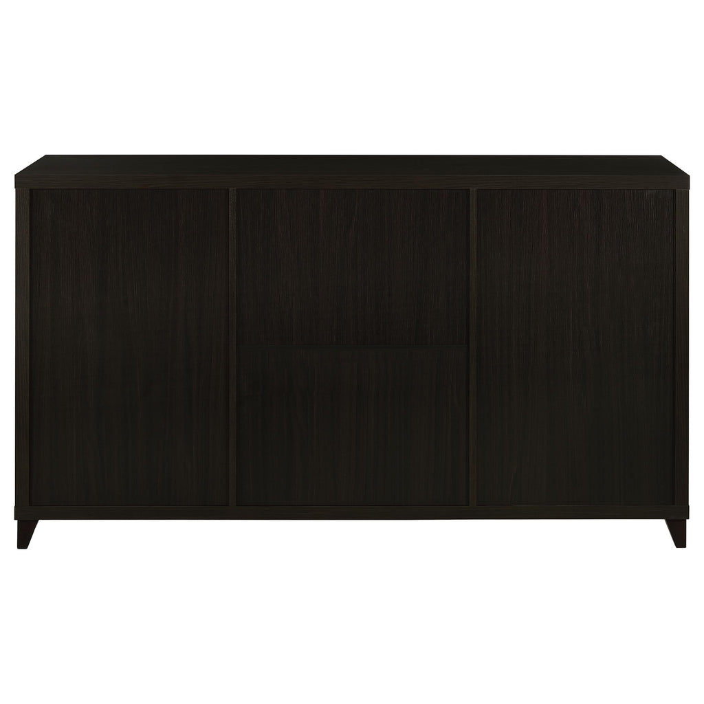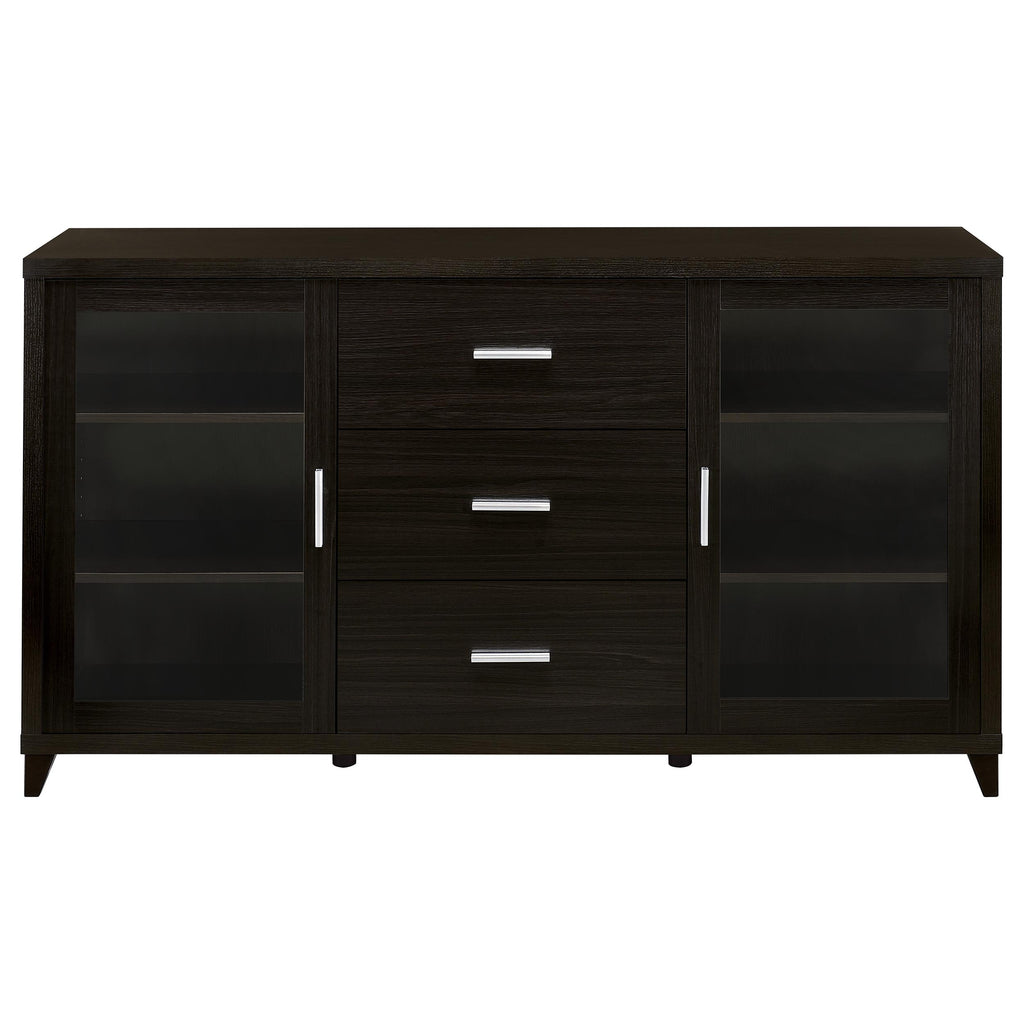 Designed for both storage and display, this 60-inch TV stand combines elegance with everyday function. Finished in rich cappuccino, it features a wide surface that supports televisions up to 65 inches. Two framed clear tempered glass doors reveal adjustable shelving for media players or decor, while three spacious center drawers provide concealed storage for movies, games, or accessories. Brushed silver hardware and tapered legs add a refined touch, making this entertainment center a stylish and practical anchor for your living room._x005F_x000D_ Key Features: • Cappuccino 60-inch TV stand with modern silhouette and brushed silver hardware • Surface accommodates televisions up to 65 inches for versatile entertainment use • Two framed clear tempered glass doors reveal four adjustable storage shelves • Three spacious drawers provide concealed storage for movies, games, or devices • Constructed from engineered wood with scratch-resistant laminate veneer finish • Euro drawer glides and tapered legs ensure smooth function and lasting durability