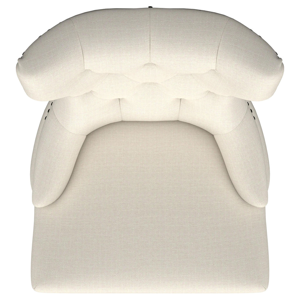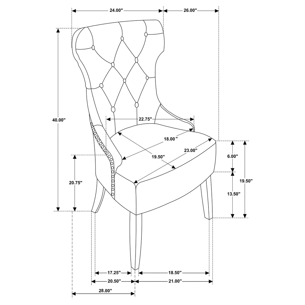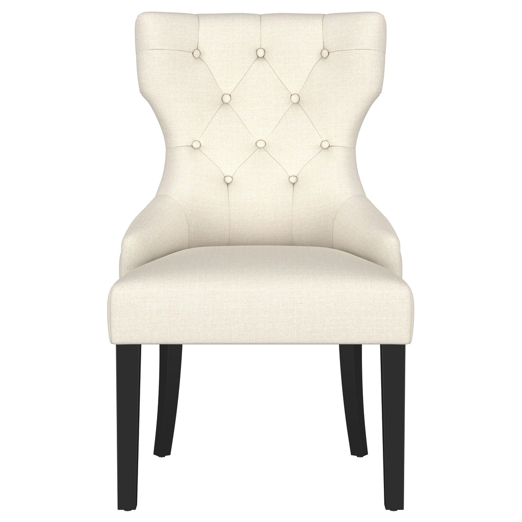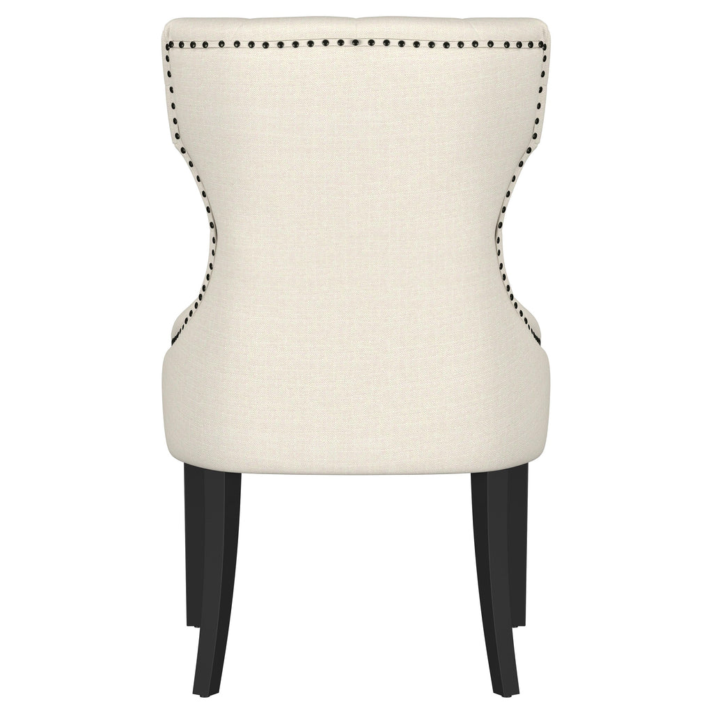 Enjoy an intriguing silhouette with a classic look. Graceful curves and angles form an eye-catching design in this dining chair. Perfect for transitional spaces, its modern design is softened with lovely beige upholstery and tufting on its seat back. Individually hand-applied nailhead trim infuses charm and style. Beautifully contrasting legs in a warm brown finish add a balanced look with curves and tapers. Key Features: • Enjoy a classic silhouette with graceful curves and angles for an eye-catching design • Perfect for transitional spaces, modern design softened with beige upholstery and tufting on seat back • Individually hand-applied nailhead trim infuses charm and style • Contrasting legs in warm brown finish add a balanced look with curves and tapers • Ideal for any room, this chair is sure to make a statement