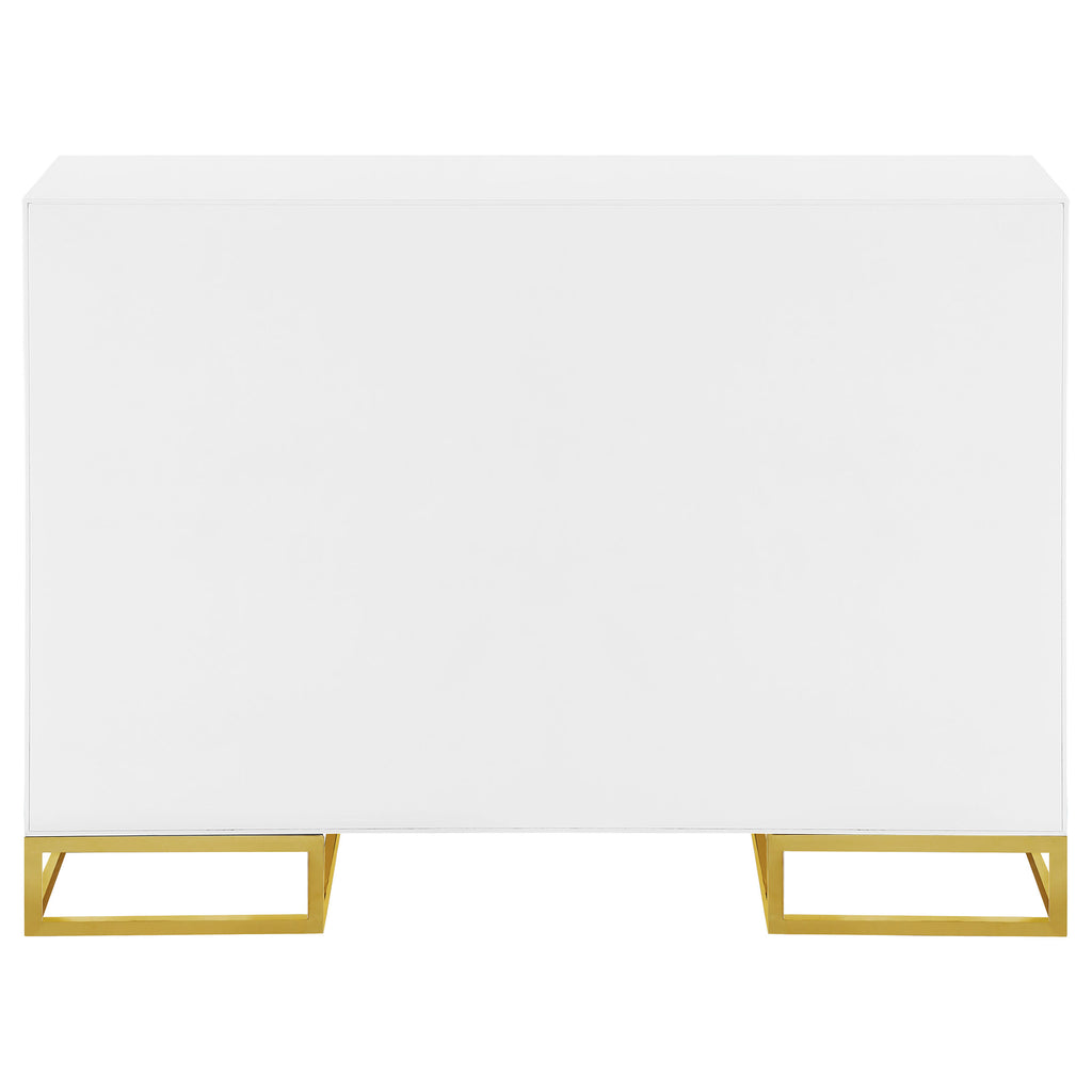 Add a bold statement piece to your space with this stunning modern accent cabinet. Featuring a glossy white finish with lustrous gold stainless steel trim, it showcases Art Deco flair with clean lines and geometric base supports. Behind double doors, adjustable shelves offer customizable storage. Crafted from durable MDF and stainless steel, this cabinet blends glamour and function beautifully in any setting.