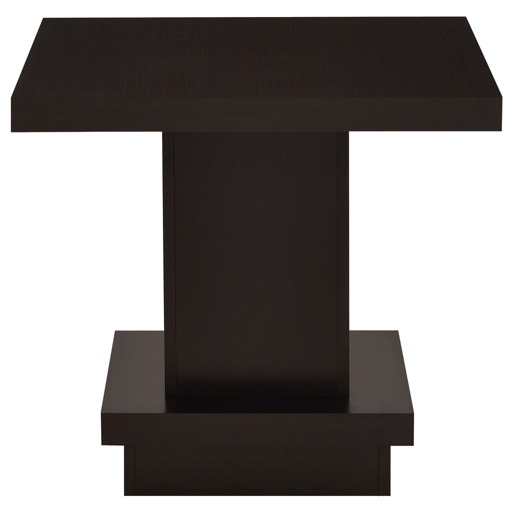 This square end table combines modern design with functional appeal, making it a versatile addition to any space. Constructed from engineered wood and finished with a scratch-resistant laminate veneer, it features a sleek cappuccino finish that exudes contemporary elegance. The bold, tiered silhouette creates a striking look while providing stability. Perfect as an accent table, it offers a spacious surface for decor or essentials, enhancing your living room's overall style. Key Features: • Square end table showcases a clean, bold geometric design • Cappuccino finish adds a sleek and contemporary touch • Durable laminate veneer resists scratches for lasting beauty • Compact tabletop offers space for essentials or decor accents • Engineered wood construction ensures strength and durability • Modern tiered silhouette enhances its visual appeal