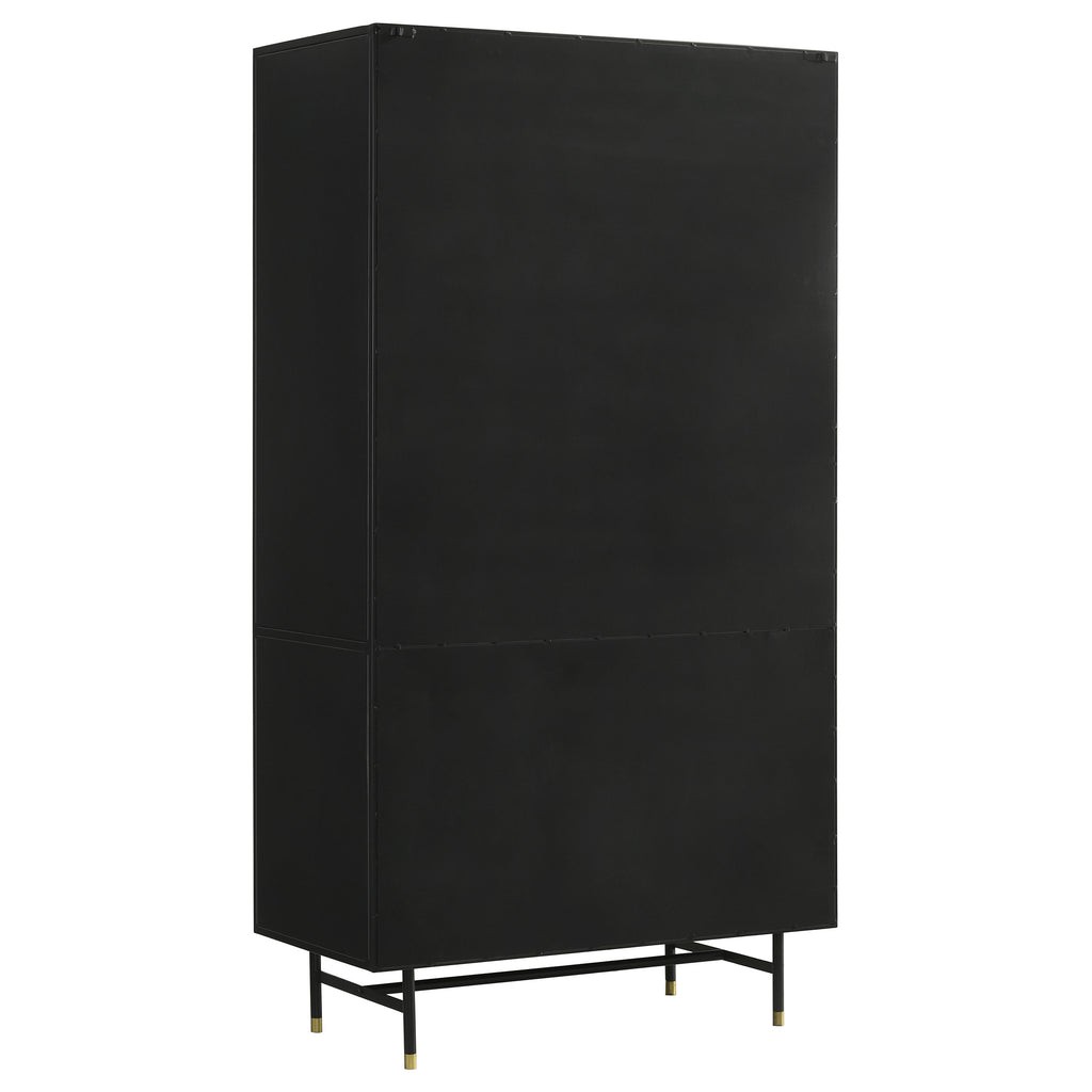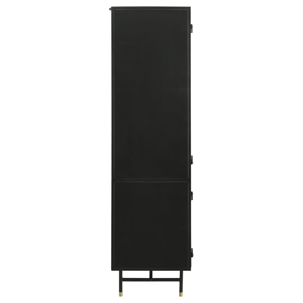 This industrial style metal cabinet offers ample storage space and a bold look in a space. With its matte black finish and accents of antique brass finish hardware, the cabinet offers a subtle contrast while exhibiting style and grace. With its tall design and rectangular shape, this cabinet takes up minimal floor space, bringing the eye up to showcase decor and collections behind tempered glass doors. Adjustable shelves and interior shelves behind the bottom cabinet keep everything from barware to throws and linens. Resting on a trestle base with legs capped in a matching antique brass finish hardware, this elegant and stately accent cabinet offers a touch of glam too. Key Features: • Industrial inspired cabinet in simple matte black iron and tempered glass • Showcase your books, collections, or décor or use it as a bar cabinet for your barware • Top two shelves of the cabinet are adjustable • Antique brass finished hardware • Constructed with iron, tempered glass, and metal