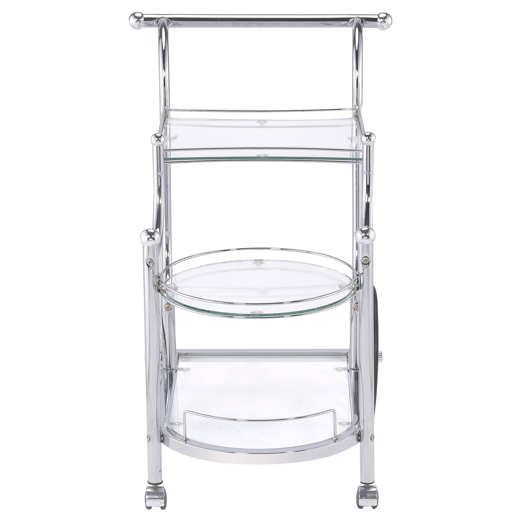 A fun traditional theme offers delightful charm that works perfectly in a traditional or transitional space. This serving cart mimics old fashioned style as it aids in delivering food and spirits to eager guests. Enjoy the captivating look of rustic wheels. Graceful curves create a compelling fluid silhouette on a cart made from metal with finishes in distressed white and chrome. Two tempered glass shelves hold beverages and implements. Key Features: • Carriage style serving cart dazzles with timeless appeal • Chrome finish further enhances classy feel • Three (3) tiers of clear tempered glass shelving with guardrails provide strength and style • Spoke wheels and casters add antique-style detail • Steel and glass construction