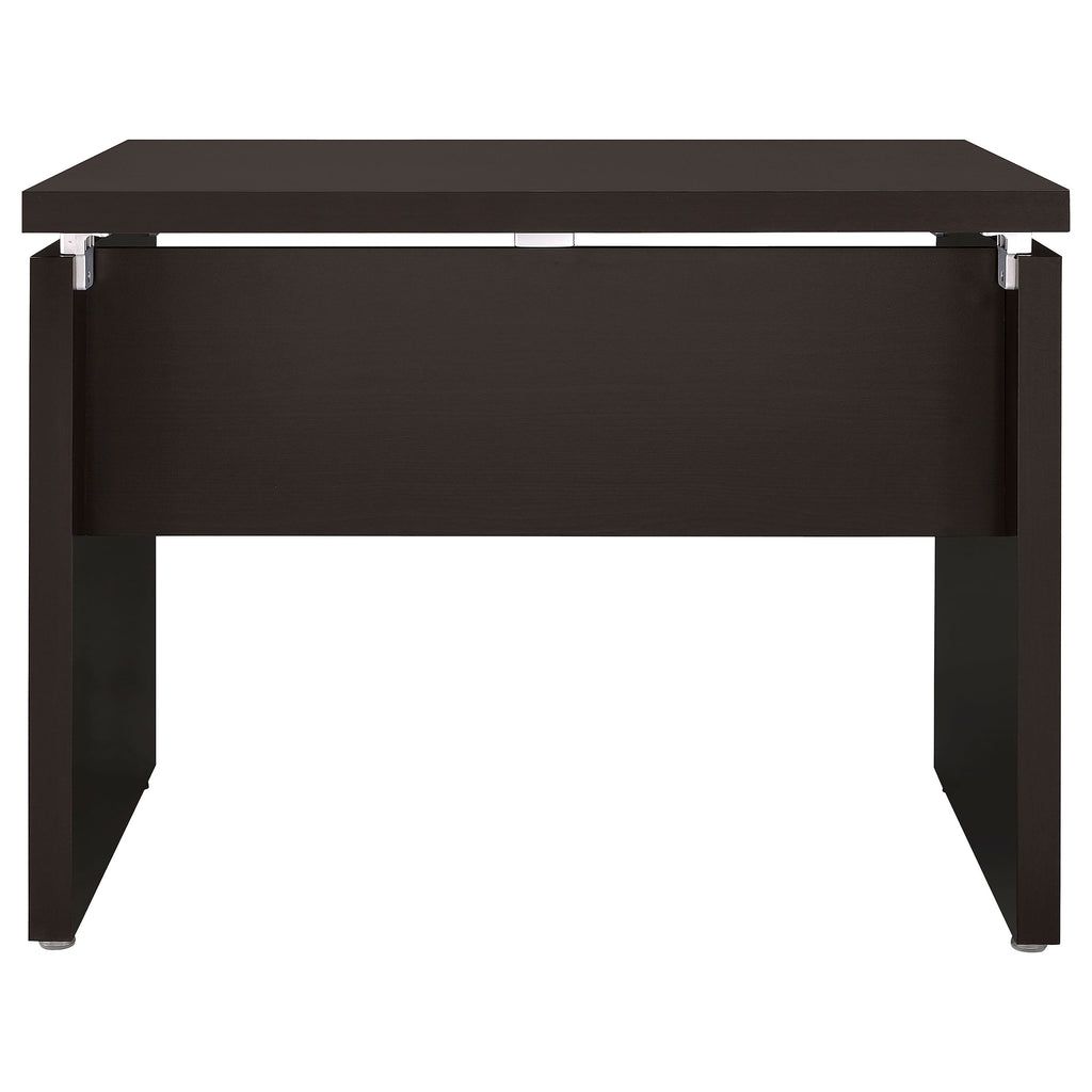 Enhance your workspace with this versatile writing desk, designed for functionality and modern appeal. The rich cappuccino finish complements a minimalist aesthetic, while the floating desktop design adds a contemporary touch. This compact yet sturdy desk is perfect for standalone use or as an L-shaped extension when paired with a matching desk. Crafted from engineered wood and laminate, it provides durability for daily work, study, or home office tasks. Sleek silver metal accents elevate the look, making it a stylish addition to any workspace. Key Features: • Compact writing desk with a sleek, minimalist floating top design • Cappuccino finish brings warmth and sophistication to any office space • Pairs seamlessly with a matching desk to create an L-shaped workstation • Spacious work surface ideal for writing, studying, or computer use • Durable MDF and engineered wood construction ensures longevity • Silver hardware accents add a refined, modern touch