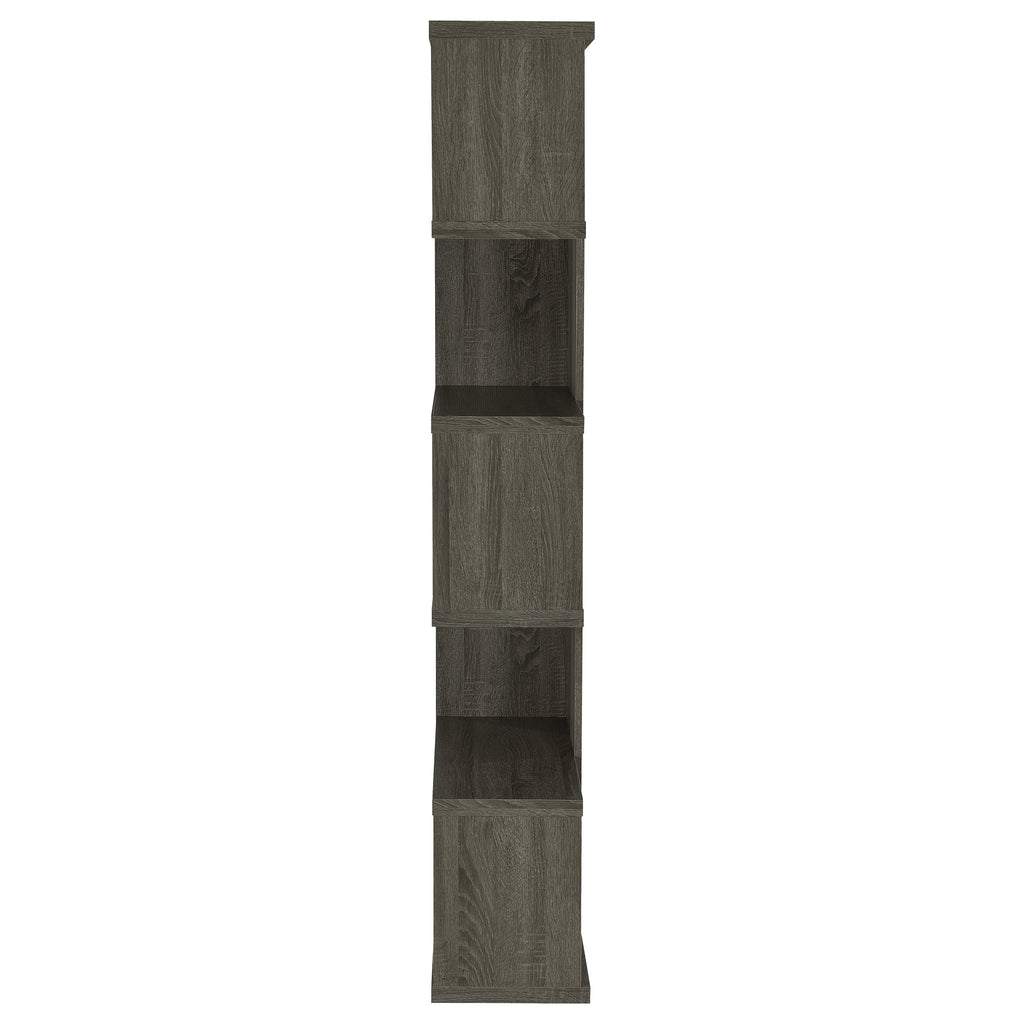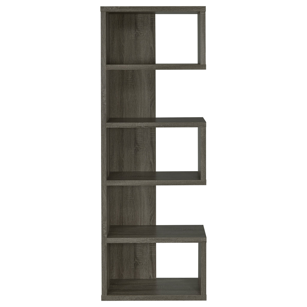 Purposeful imbalance tells a story. Designed with a whimsical profile, this bookcase brightens up a contemporary space. A visually pleasing arrangement of five tiers creates shelf space for books and decor. Finished in a cool weathered grey, it provides versatility and design power. Make this bookcase a focal point in a home office or casual room. Key Features: • Asymmetrical five-tier bookshelf in weathered grey laminate veneer • Offset shelf layout delivers artistic presence and visual rhythm • Crafted from engineered wood and scratch-resistant laminate • Compact vertical profile ideal for smaller home office setups • Versatile neutral finish coordinates with rustic or urban interiors • Includes tip-over restraint for enhanced safety and stability