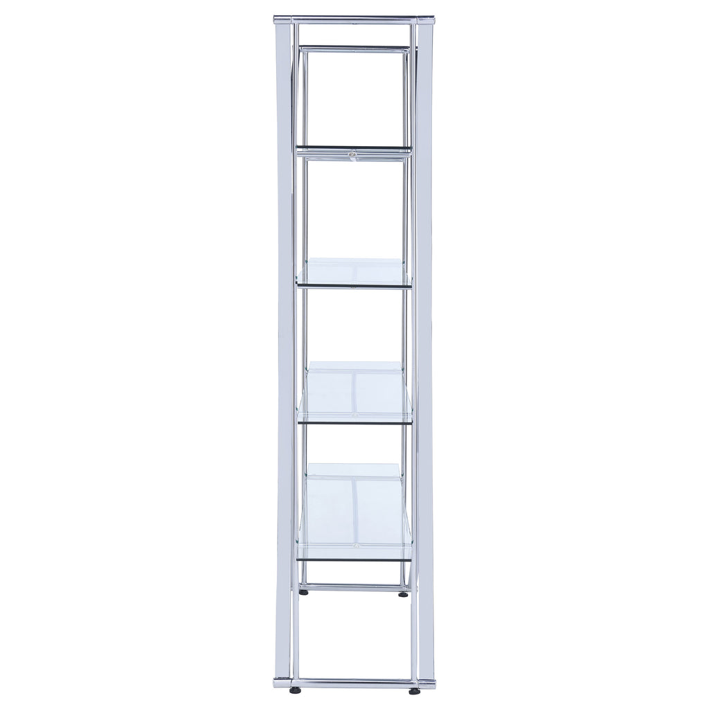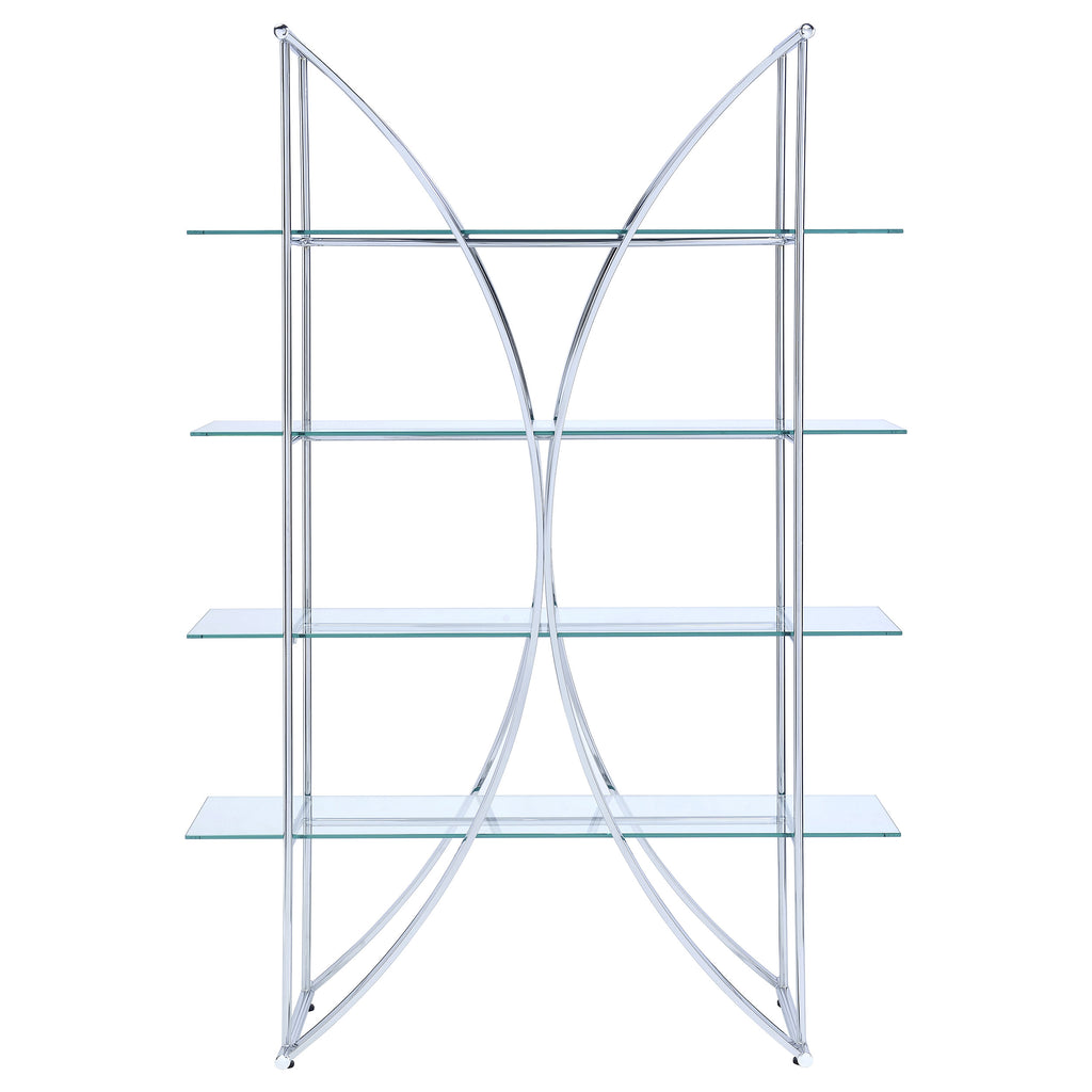 The ultimate in contemporary design rests in this eye-catching bookcase. Modern architecture meets art in a compelling silhouette blending arc-shaped and linear steel frames with clear tempered glass shelves. Four tiers offer ample space for displaying books, decor, and potted greenery. A fresh chrome finish adds luster to a tastefully designed contemporary space. Energize a modern room with a subtle yet tasteful bookcase. Key Features: • Sleek, graceful silhouette combines clean, straight lines with gentle curves • Bookcase features high quality electroplated chrome finish • Clear tempered glass shelves • Features four (4) versatile tiers of shelving • Metal and glass construction