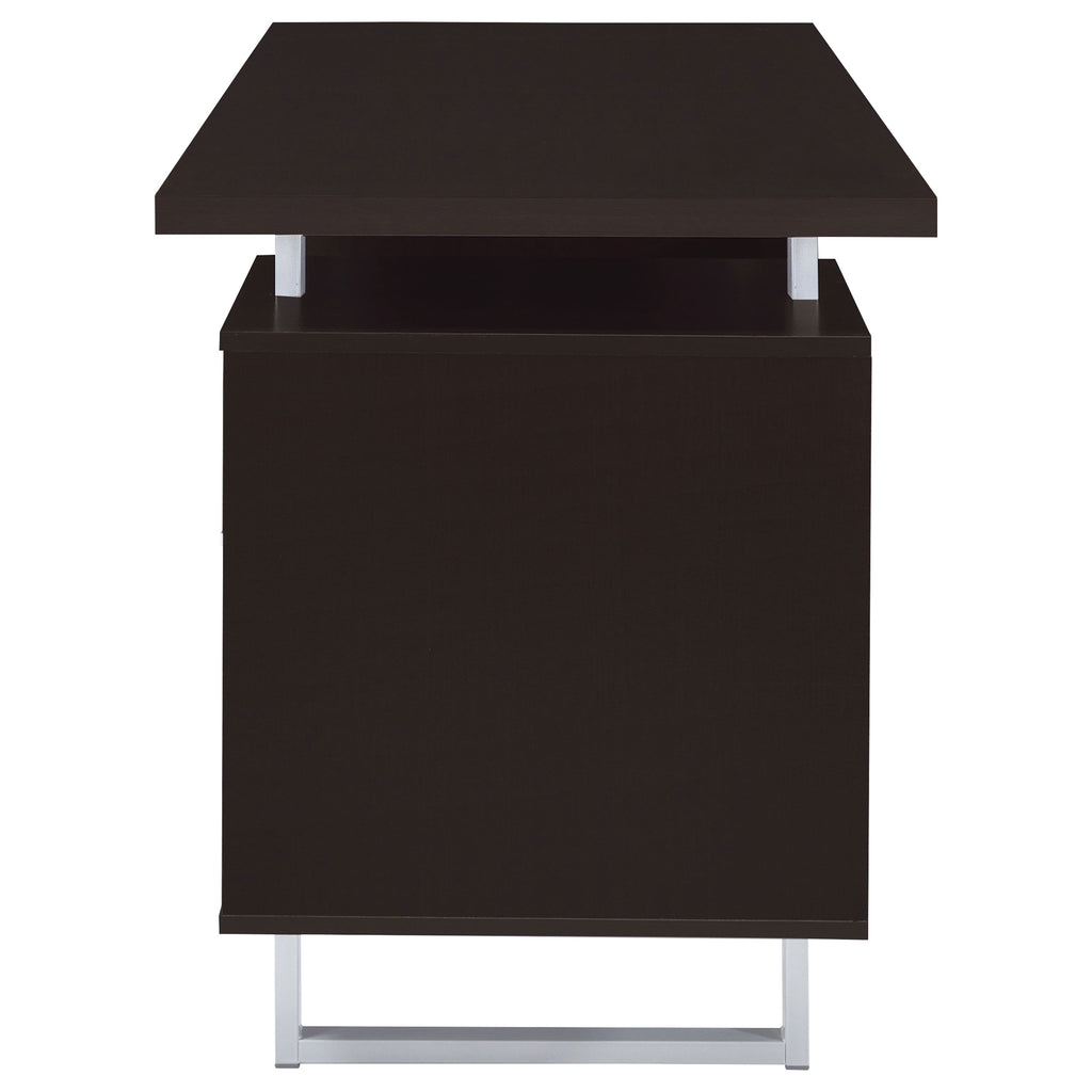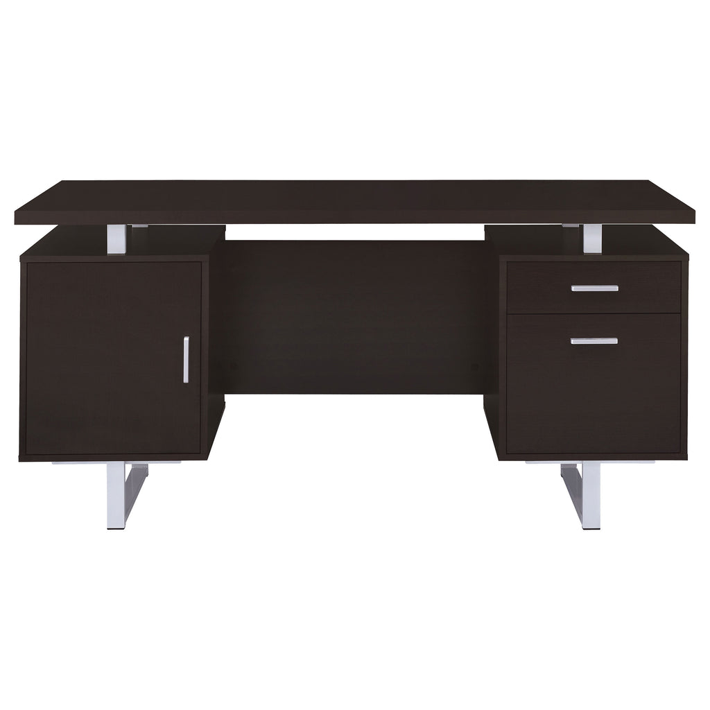 Enjoy an intriguing architectural design in this office desk. A floating top creates a visually enticing effect and a completely different look. Finished in cappuccino, it flatters surrounding decor and delivers a dramatic touch. Store essentials in a cabinet and drawer, and use a file cabinet to organize papers. Contrasting silver hardware and steel legs plays up the contemporary flavor of this stylish desk. Key Features: • Classy office desk in cappuccino finish • Clean metal base in silver finish • Simple desk includes one (1) storage cabinet, one (1) storage drawer, and one (1) file cabinet • File cabinet holds both legal and letter size files • Metal, MDF, particle board, and laminate construction