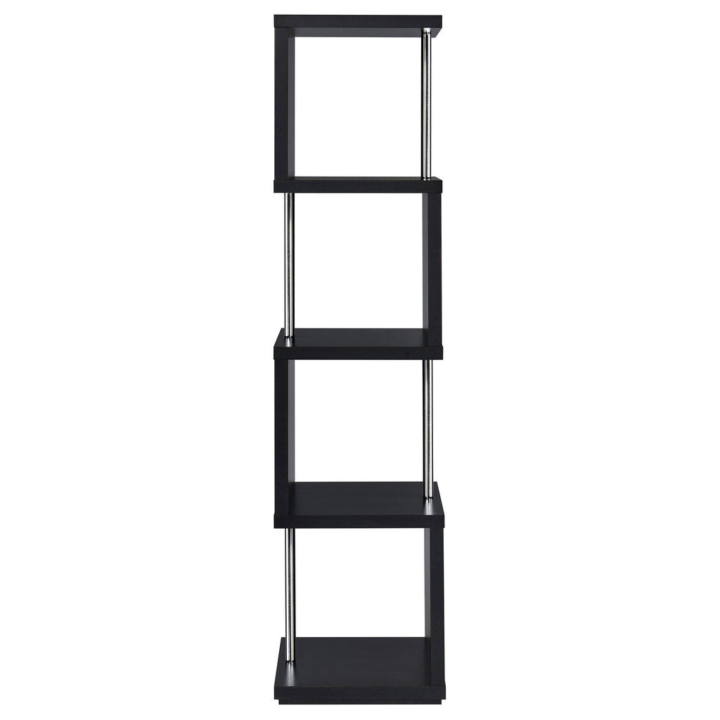Go with the flow in a modern space with an edgy, artistic look. This four-tier bookcase is a great option for a compact space. Enjoy a modular, geometric silhouette and a choice of finishes. Steel supports reinforce shelving that hosts books and decor. Choose from finishes that intensify the attitude of your custom space. Key Features: • Modern cube-style bookshelf in black finish with chrome metal rod accents • Stacked four-tier open frame provides versatile shelf space • Engineered wood with laminate veneer ensures lasting performance • Electroplated chrome rods offer sleek, polished contrast • Ideal for displaying books, plants, or decorative objects • Tip-over restraint included for secure wall attachment