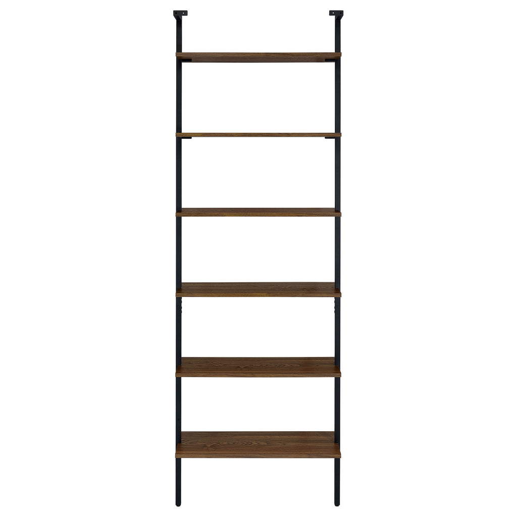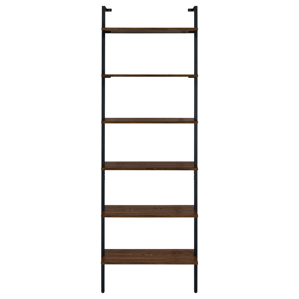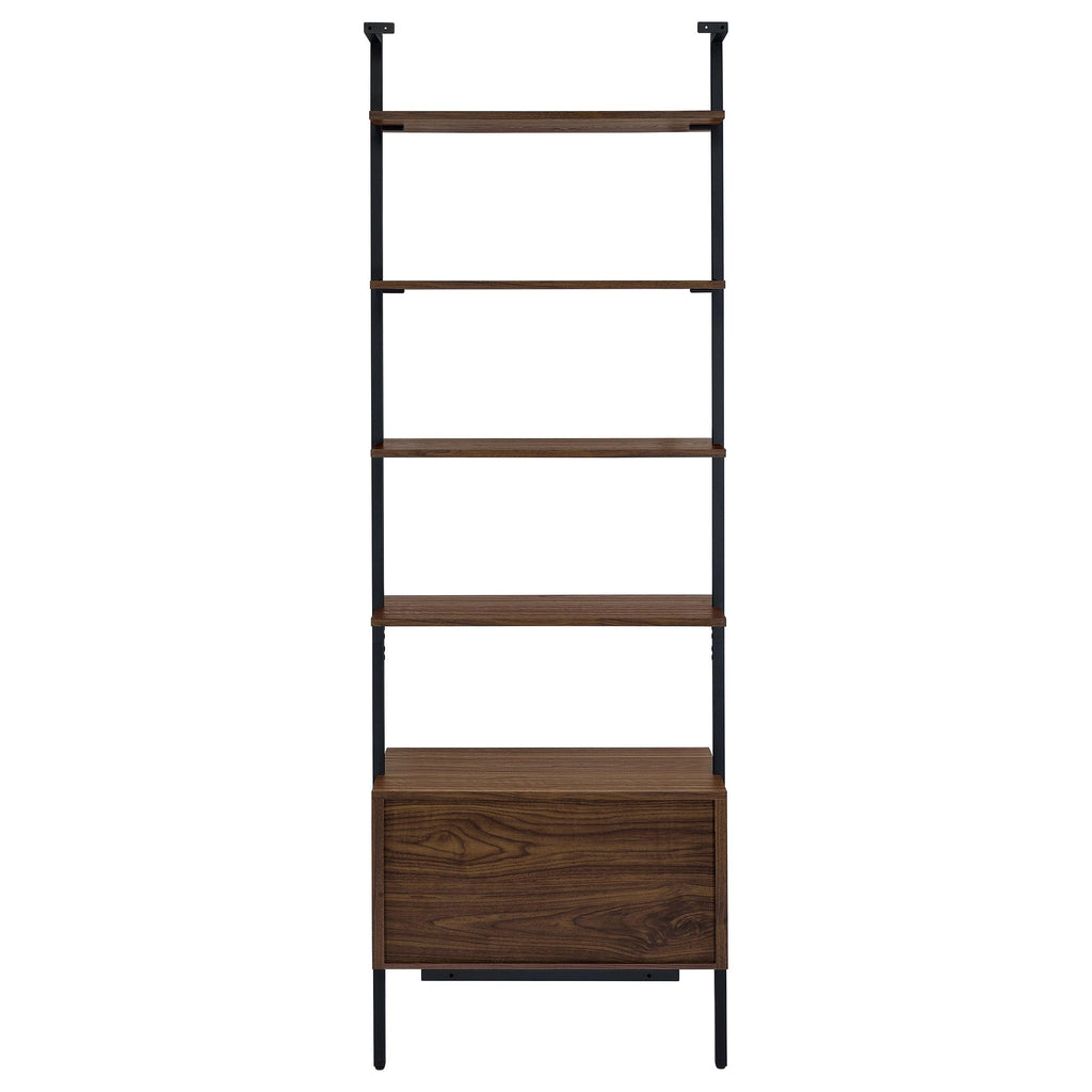 Play up the light, airy ambiance of a modern space while making use of every inch with a modern wall bookcase. It features four floating upper shelves and a lower case with two drawers, perfect for a blend of storage and display in any room. The shelves and two drawers feature a warm walnut finish over melamine paper, offering durability for a lovely look that lasts. A black finish metal frame supports the bookcase, offering neutral appeal in any setting. Stash essentials in the drawers while adding decor to shelves for a personal look and feel. Key Features: • Achieve a minimalist look with the open, airy style of a modern four-shelf wall bookcase • Features four floating shelves and two drawers for a light, refined look in your bedroom or den • Shelves and drawers feature a deep walnut wood finish over melamine paper that's durable and stylish • Metal frame features clean, straight lines and a rich black finish for neutral appeal • Adds storage and maximizes space beside an entertainment center or in a home office